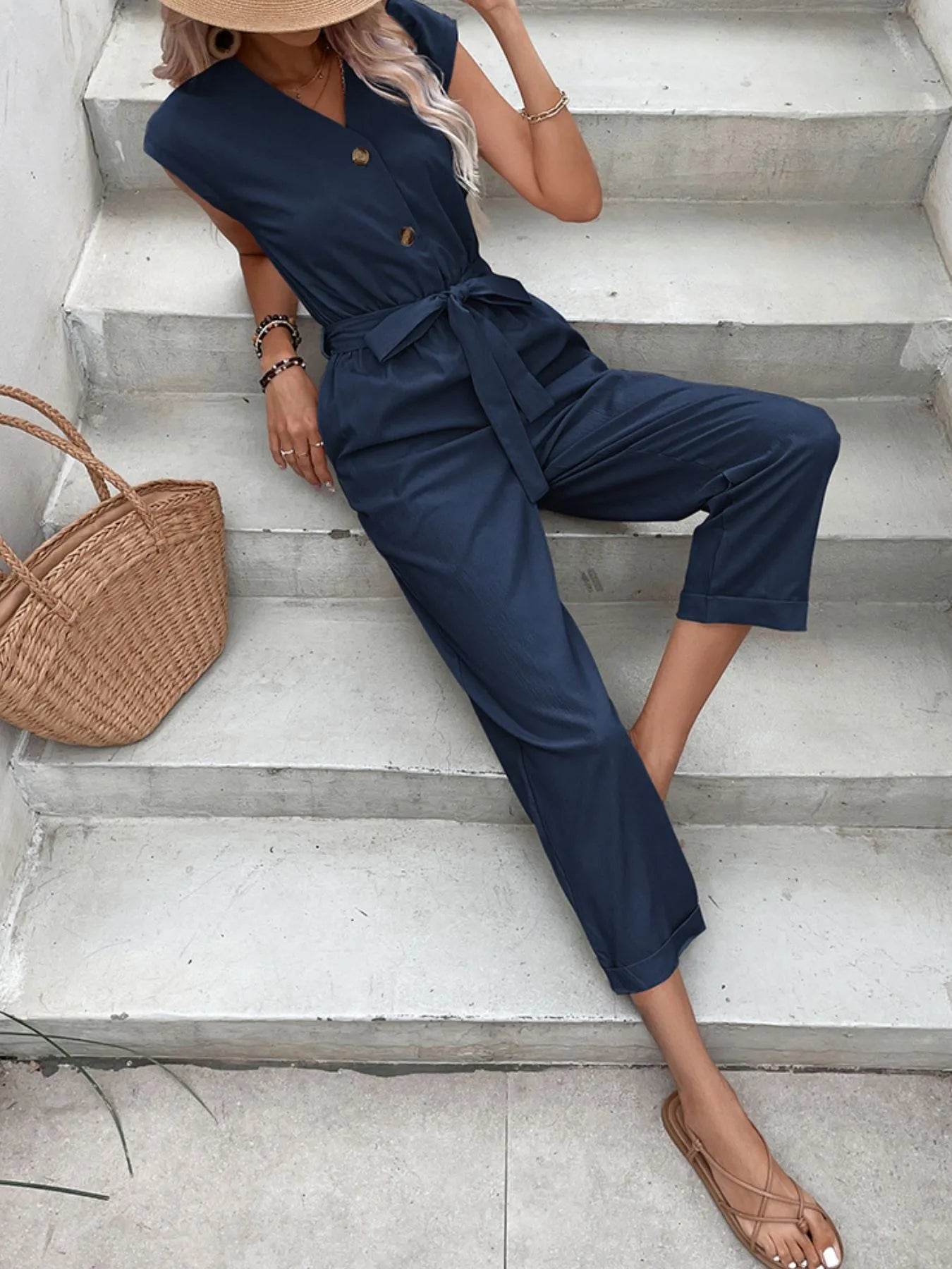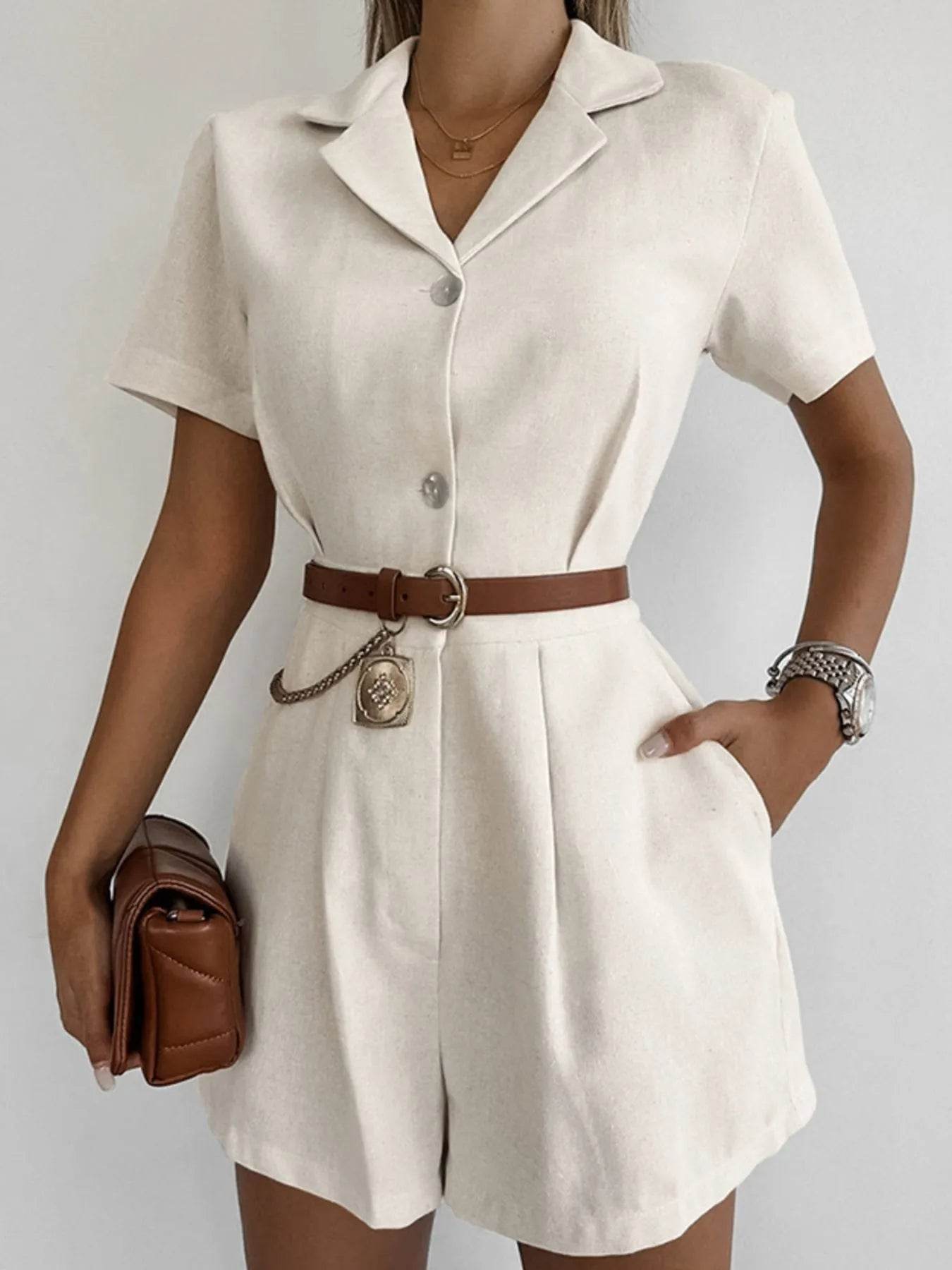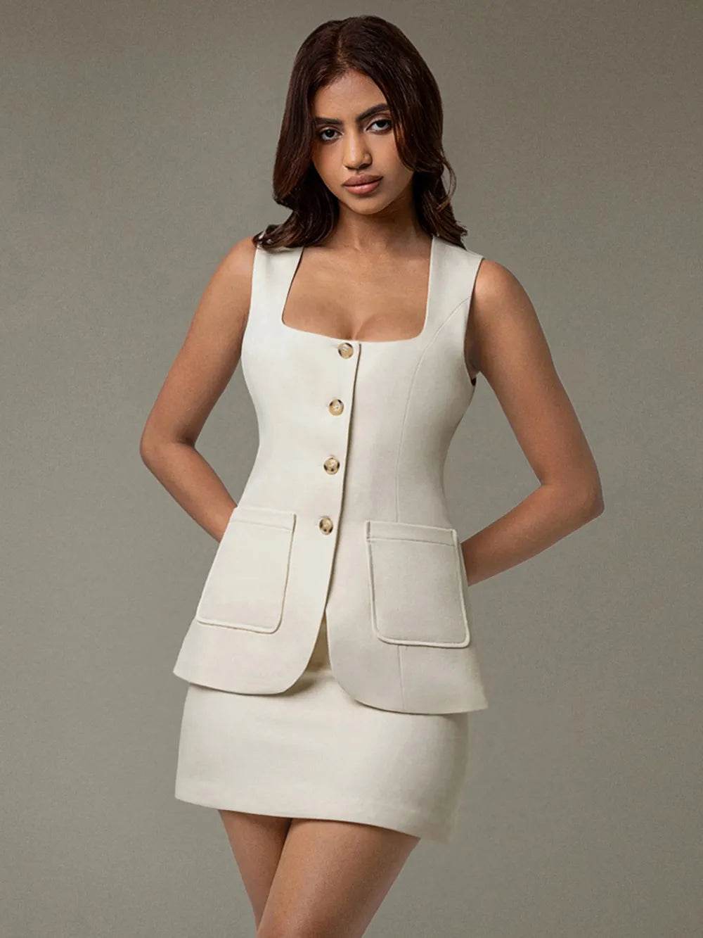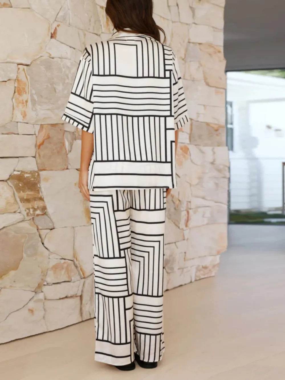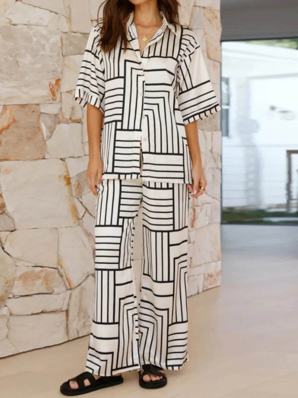 Design: The set features a structured button-up top and matching bottoms, offering a coordinated, effortlessly chic look.