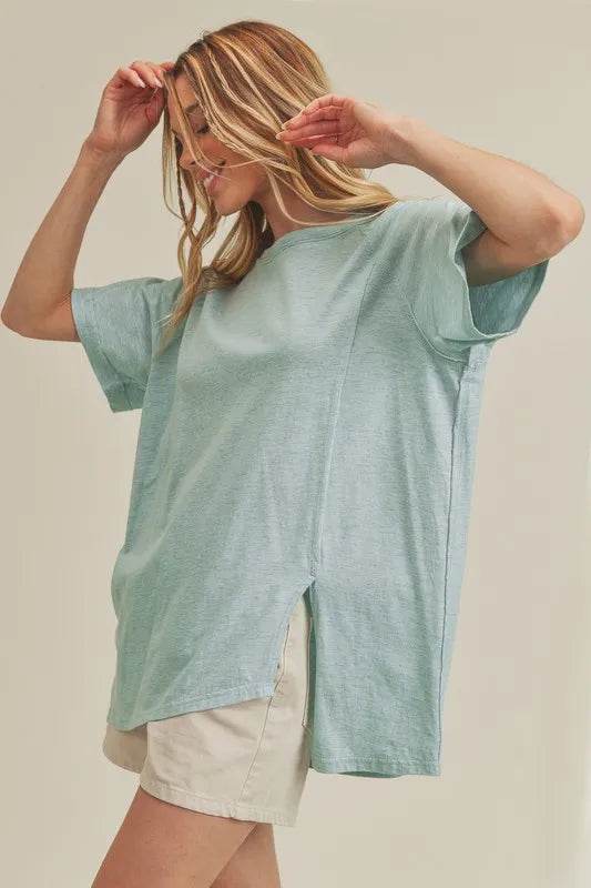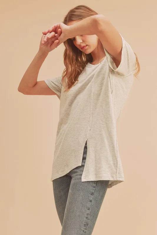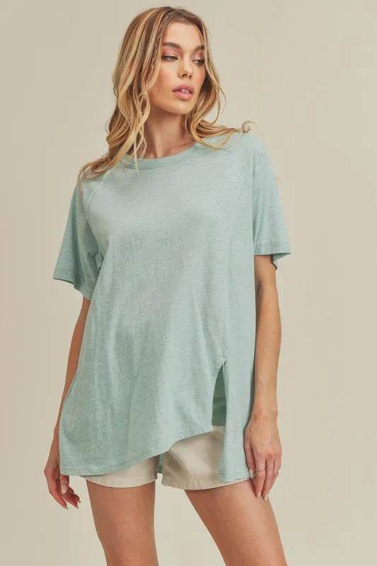 The Asymmetrical Front Slit Round Neck Raglan Sleeve T-Shirt features a stylish and modern design. With its asymmetrical front slit detail, this shirt offers a unique twist on a classic silhouette. The round neck adds a timeless touch, while the raglan sleeves provide a comfortable and sporty look. This t-shirt is versatile and can be dressed up or down depending on the occasion, making it a chic and trendy addition to your wardrobe.