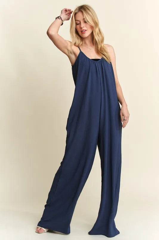 A wide leg casual cami jumpsuit combines comfort and style for a relaxed yet chic look. The wide-leg pants offer a breezy and flowy silhouette, while the cami top adds a touch of elegance. This jumpsuit is perfect for casual outings, brunch dates, or even a day at the beach. Pair it with sandals and statement jewelry for a laid-back yet trendy outfit.