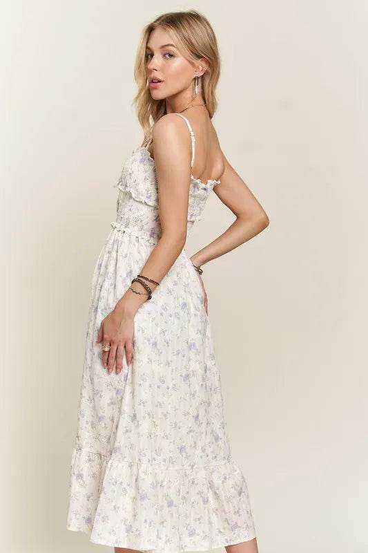 A Smocked Floral Sweetheart Neck Cami Dress is a romantic and stylish choice for your wardrobe. The sweetheart neckline adds a feminine and flattering touch to the dress, while the smocked bodice provides a comfortable and form-fitting silhouette. The floral print enhances the dress with a fresh and vibrant look, perfect for spring and summer occasions. This dress exudes a sweet and playful vibe, making it ideal for brunches, picnics, or outdoor events. Pair it with sandals or wedges for a lovely and chic outfit.