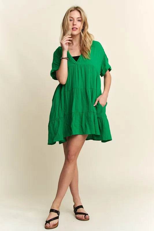 The Tiered Notched Short Sleeve Dress is a versatile and chic piece for any occasion. Its unique tiered design and notched neckline add a fashionable touch to a classic silhouette. With short sleeves, this dress offers comfort and style in one elegant package. Elevate your wardrobe with this must-have dress!