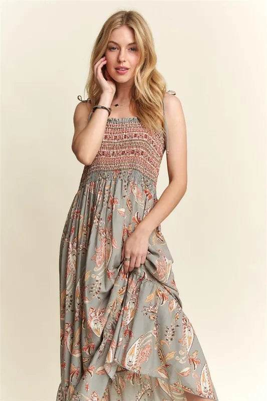 A Smocked Back Floral Adjustable Strap Midi Dress is a charming and versatile piece for your wardrobe. The floral print adds a touch of femininity and freshness to the dress, perfect for spring and summer. The smocked back detail provides a comfortable and flexible fit, accommodating different body shapes. The adjustable straps allow you to customize the fit to your preference. The midi length offers a versatile option that can be dressed up with heels for a more formal look or dressed down with sandals for a casual outing. This dress is ideal for various occasions, from brunch dates to garden parties.