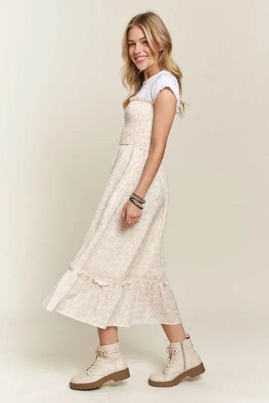 A Smocked Floral Ruffled Hem Cami Dress is a feminine and charming piece for your wardrobe. The smocked bodice offers a comfortable and flattering fit, while the floral print adds a romantic and summery touch to the dress. The ruffled hem detail gives it a playful and flirty look, perfect for warm weather and casual outings. This dress can be styled with sandals or espadrilles for a sweet and relaxed ensemble.