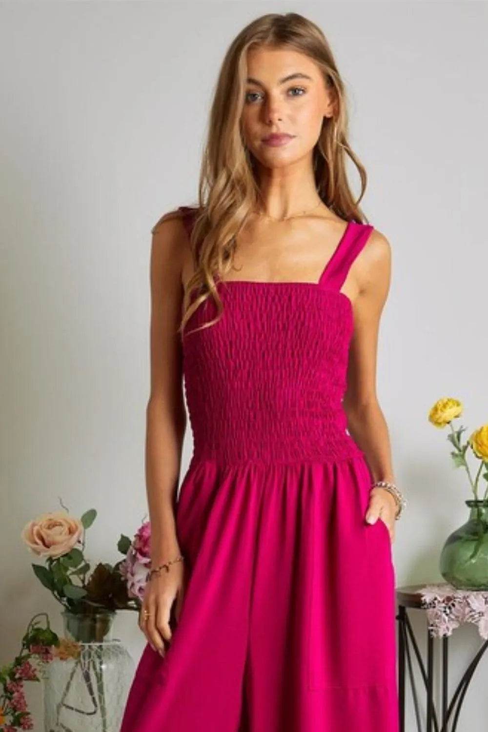 The Smocking Top Wide Leg Jumpsuit combines style and comfort effortlessly. The smocked top provides a fitted and flattering look, while the wide-leg design offers a chic and relaxed silhouette. This jumpsuit is a versatile choice for any occasion, whether it's a casual day out or a special event. Effortlessly stylish and easy to wear, this jumpsuit is a must-have in any wardrobe.
