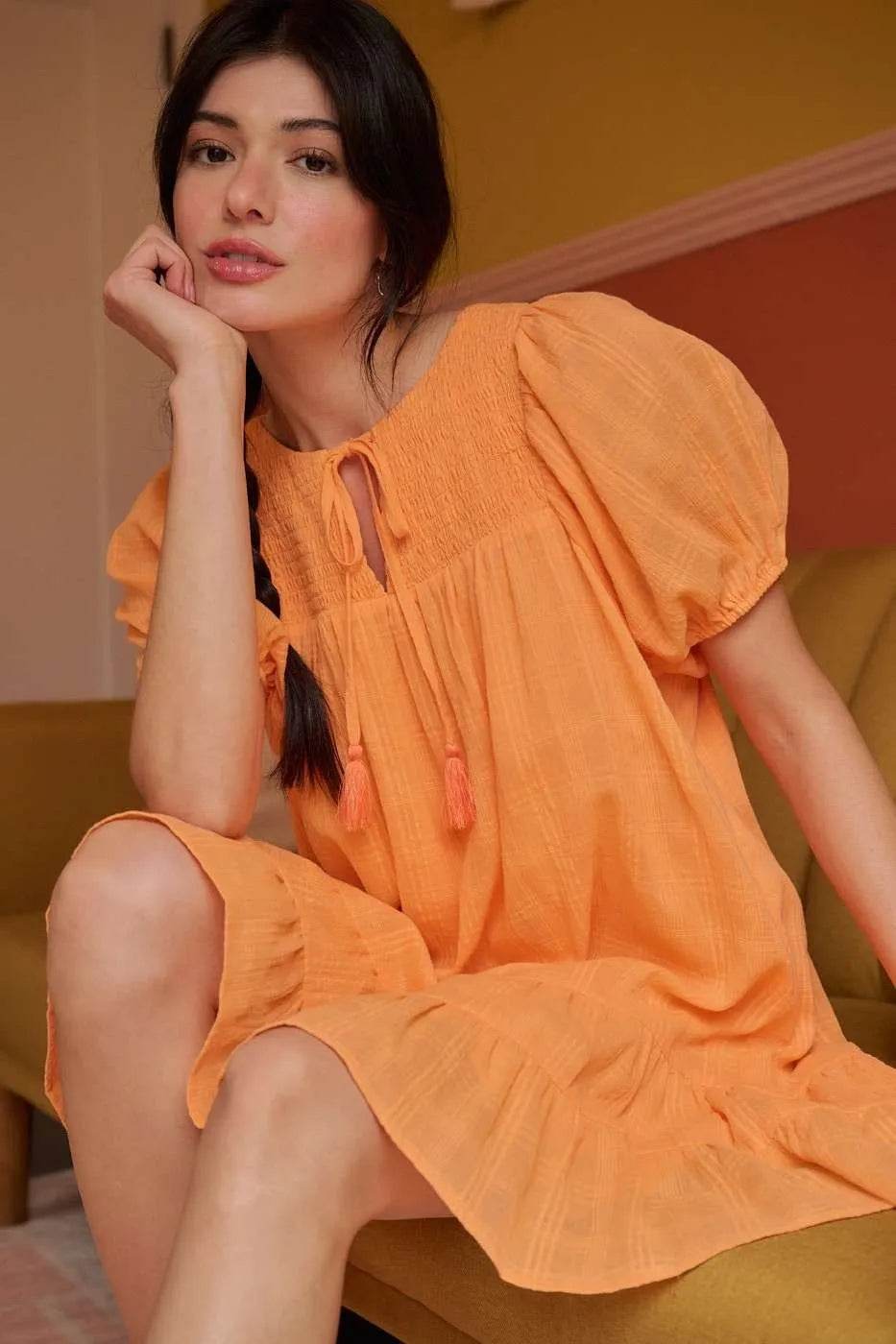 The Tassel Tie Plaid Gauze Short Sleeve Mini Dress is a fashionable and breezy piece that combines a classic plaid pattern with delicate gauze fabric and playful tassel ties. The short sleeves and mini length create a cute and casual look, perfect for warm weather days. The tassel ties add a fun and bohemian touch, adding a whimsical detail to the dress. Pair this mini dress with sandals or sneakers for a relaxed and stylish outfit that is perfect for a day out or a summer gathering.