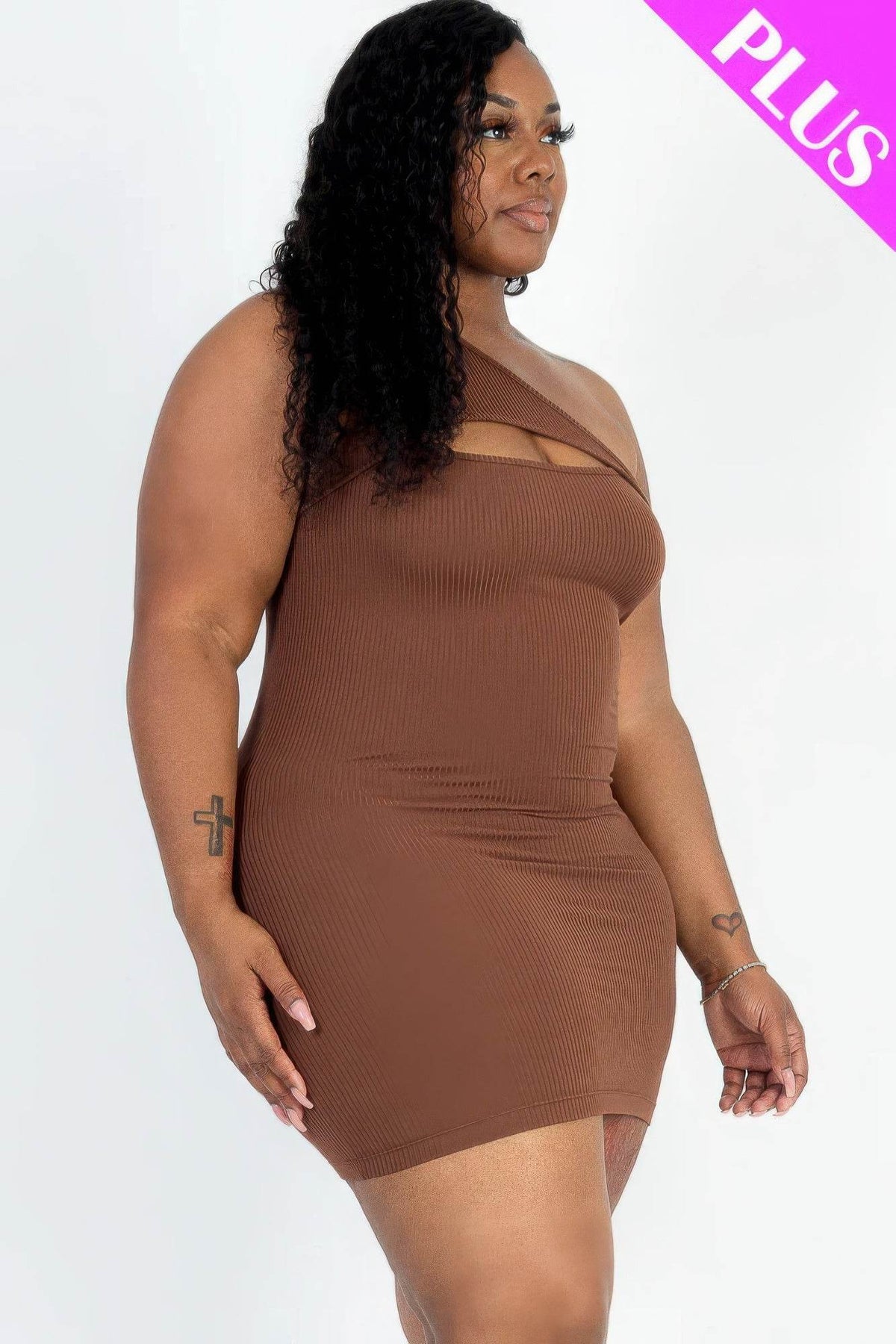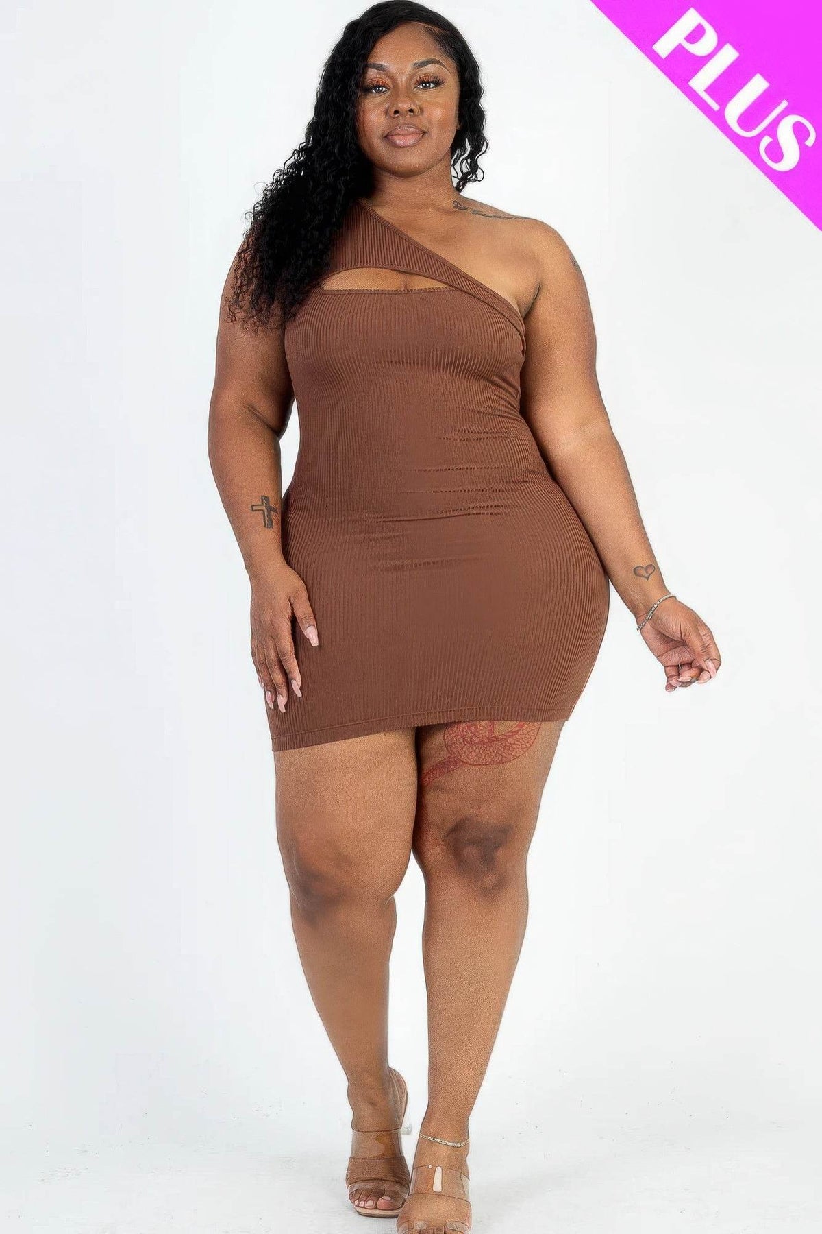 Make a stylish statement with the Plus Size Ribbed One Shoulder Cutout Front Casual Mini Bodycon Dress in Downtown Brown. Order now to experience a perfect blend of fashion and comfort!