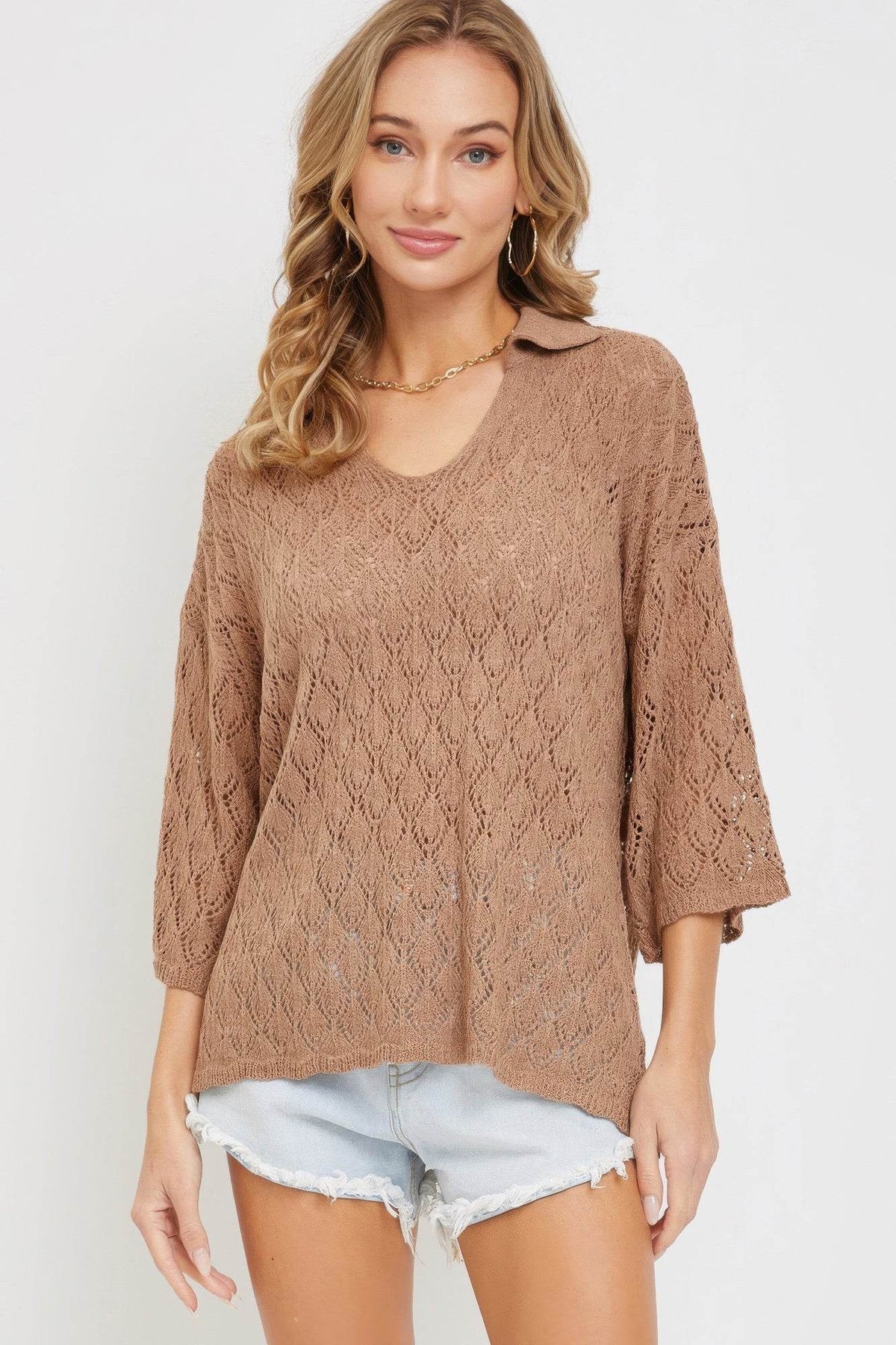 Lightweight and effortlessly polished, this pointelle knit top is the perfect piece to elevate your everyday look. Crafted in a soft open-knit design, it features a classic V-neckline with a subtle collar for a refined touch. The airy texture makes it ideal for layering, while the relaxed fit and breathable fabrication ensure all-day comfort. Whether worn over a tank or styled solo, this versatile top transitions easily from spring to summer with ease and elegance.