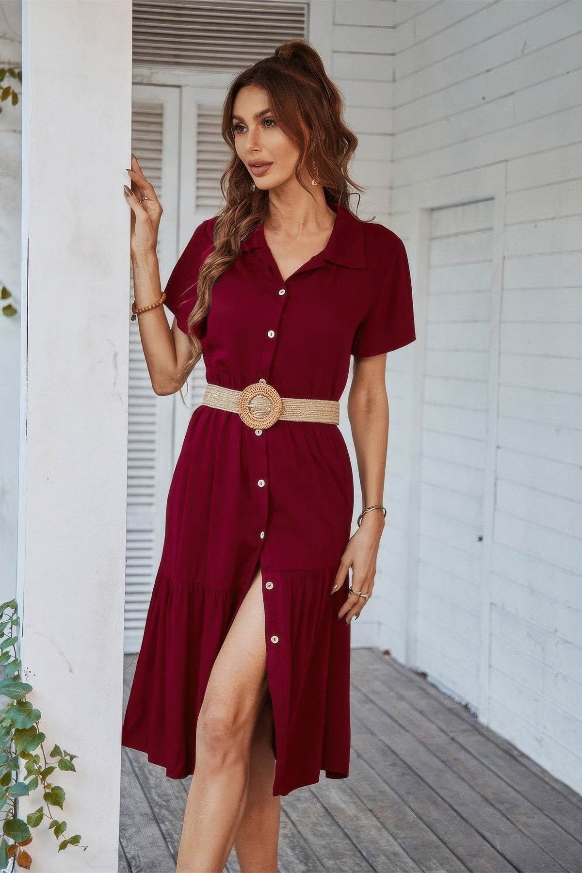 Easygoing with a hint of charm, this V-neck midi dress is the perfect blend of comfort and style. Made from 100% viscose, it offers a breathable, lightweight feel ideal for warm-weather wear. The short sleeves, button trim, and ruffle accents create a soft, feminine silhouette that moves beautifully. Designed in a tunic-style fit, it offers relaxed elegance whether you're headed out for the day or packing for vacation. Please note: belt not included, allowing you to style it your way with your favorite accessories.