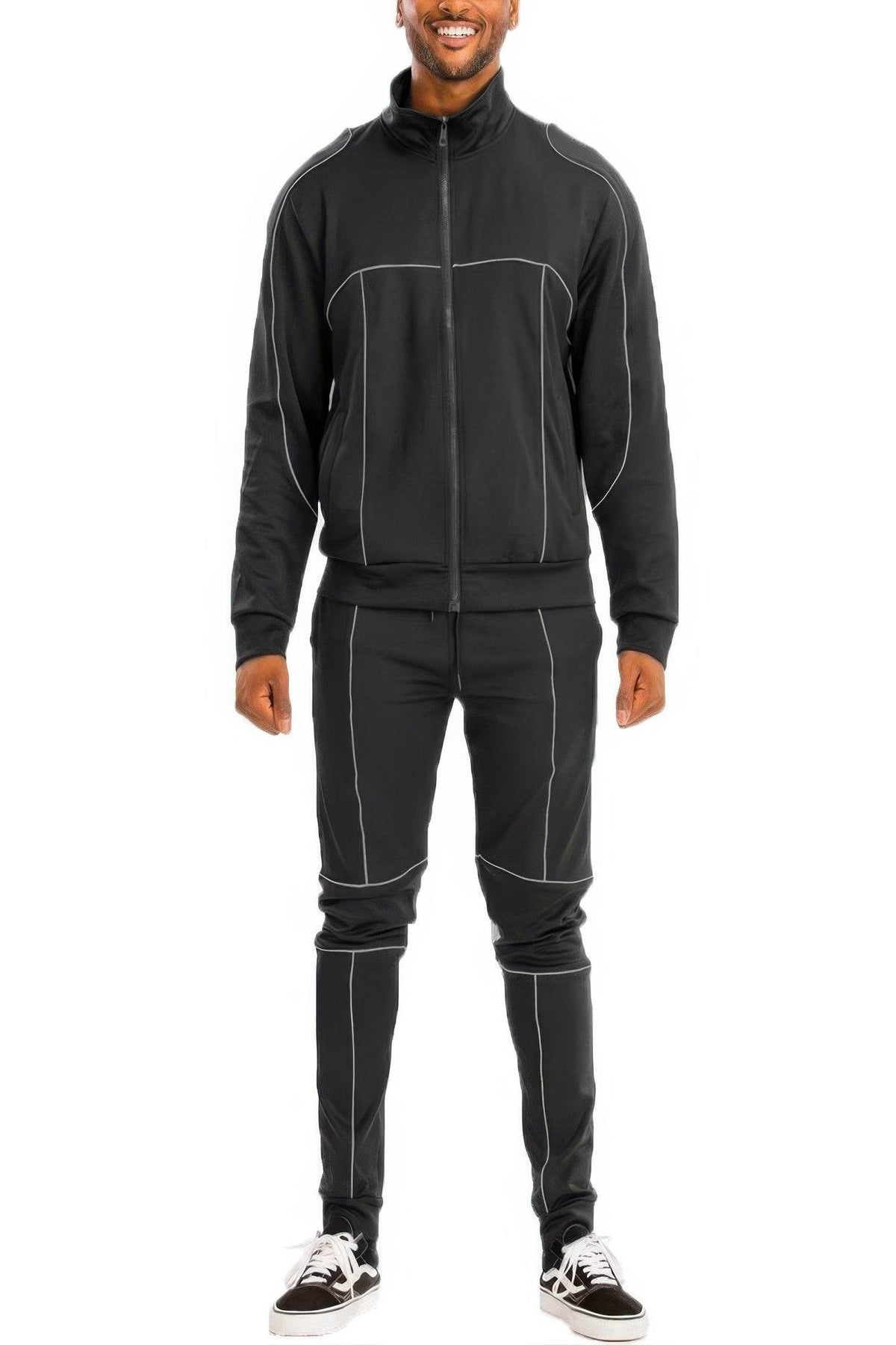 This track set combines modern design, functionality, and comfort. The reflective piping not only adds style but also improves safety during outdoor activities in low-light conditions. With its adjustable fit and versatile colors, it's the perfect choice for active lifestyles.