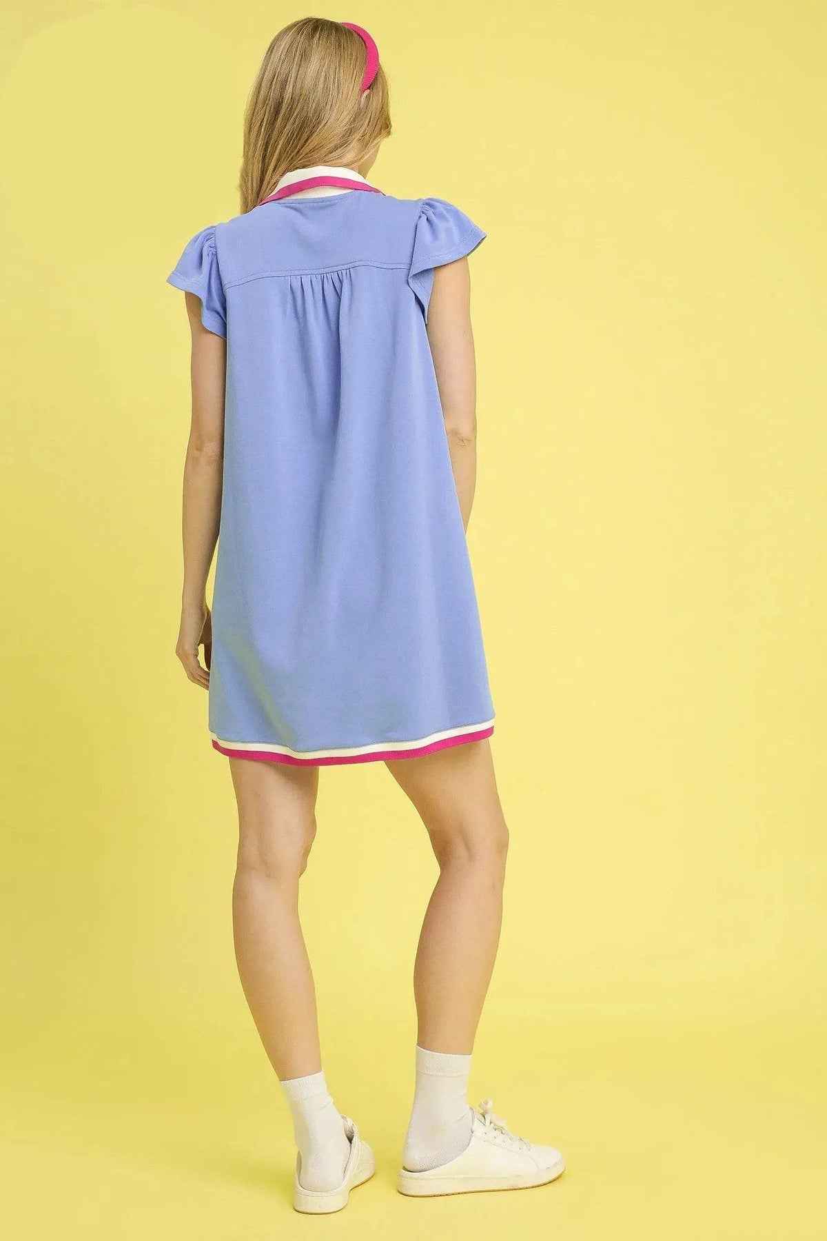 This fashion mini polo dress combines athletic inspiration with feminine style. Crafted from lightweight, breathable fabric in a beautiful periwinkle blue, it features eye-catching pink trim details along the neckline and hem. The relaxed A-line silhouette offers comfortable all-day wear, while the sporty polo collar with V-neck opening adds a preppy touch. Perfect for casual outings, weekend activities, or sporty-chic occasions. The mini length and cap sleeves provide freedom of movement, making it ideal for active lifestyles. Easy to style with sneakers for a casual look or dress up with sandals.