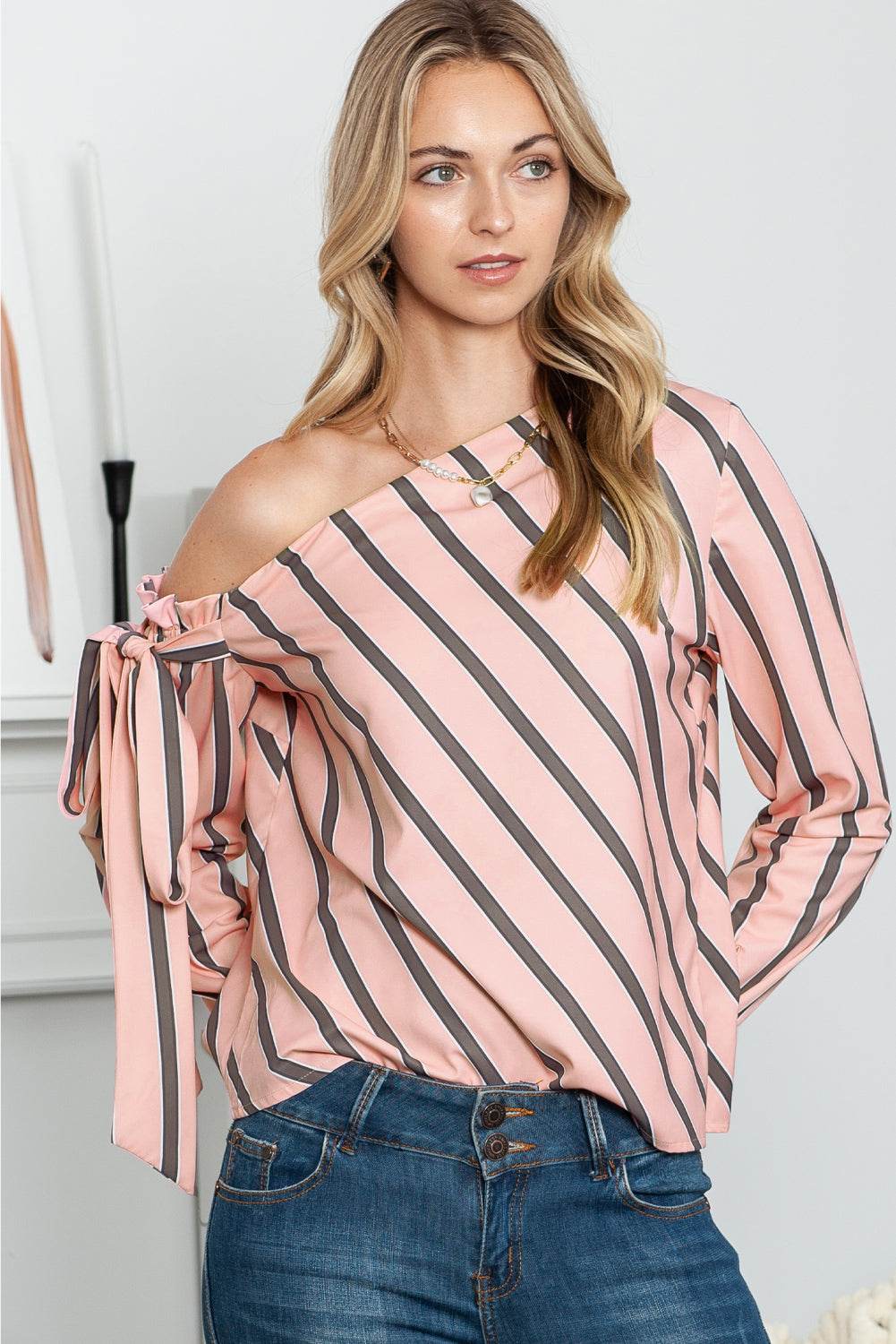 Striped Asymmetrical Long Sleeve Blouse - Ebony's Shopping
