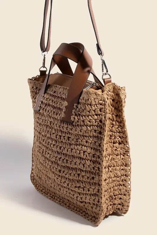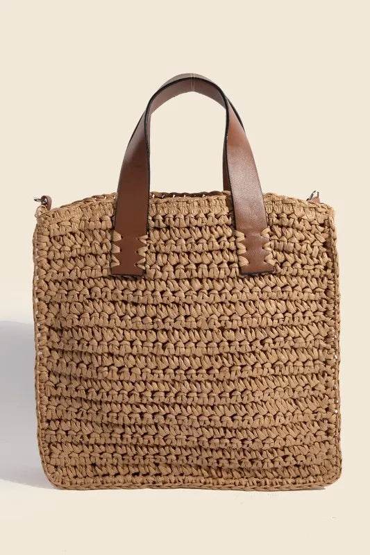 Fame Faux Leather Handle Straw Braided Handbag - Ebony's Shopping
