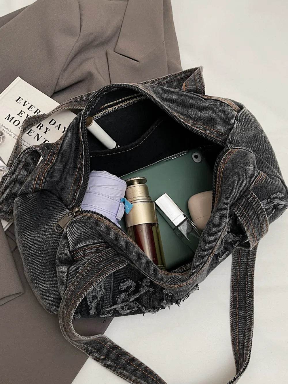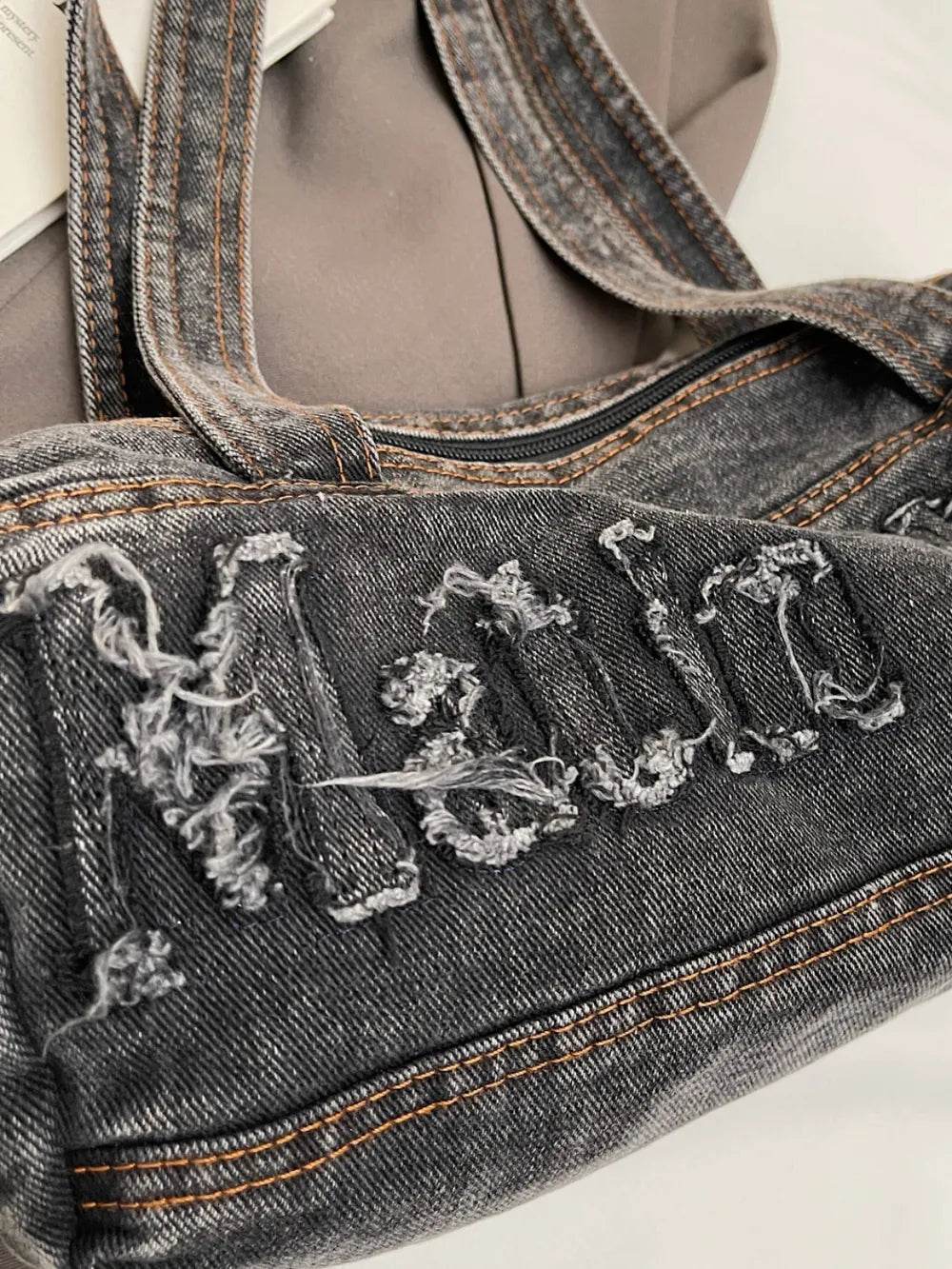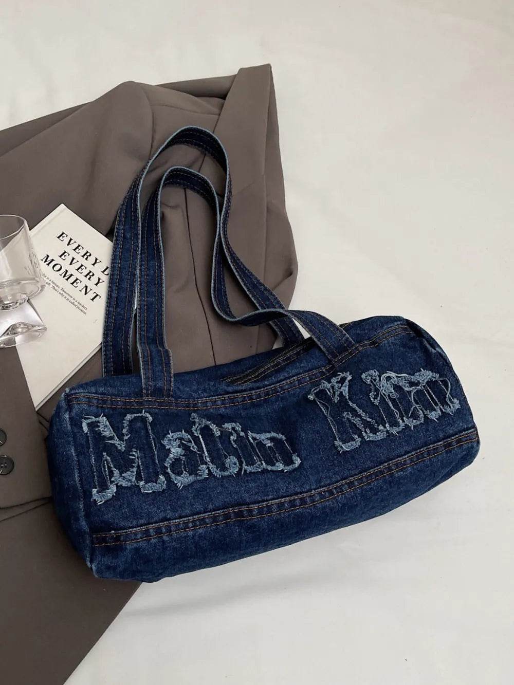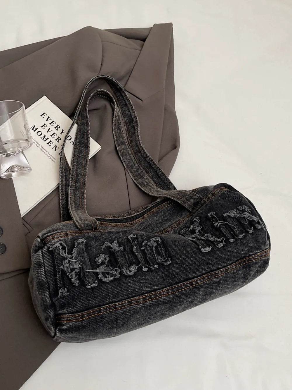 Letter Raw Edge Denim Handbag - Ebony's Shopping