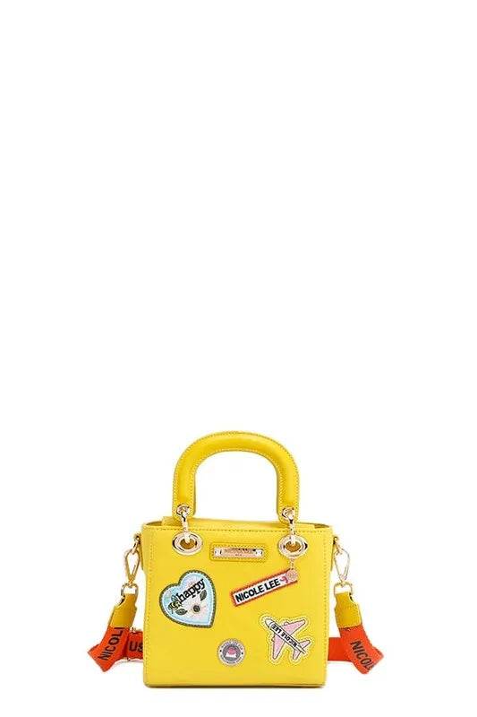 Our color patch handbag is a striking, compact statement piece with a sleek square silhouette. Vibrant travel-inspired patches and a playful crossbody strap add a pop of color and personality, letting you wear it two ways: handheld or hands-free!