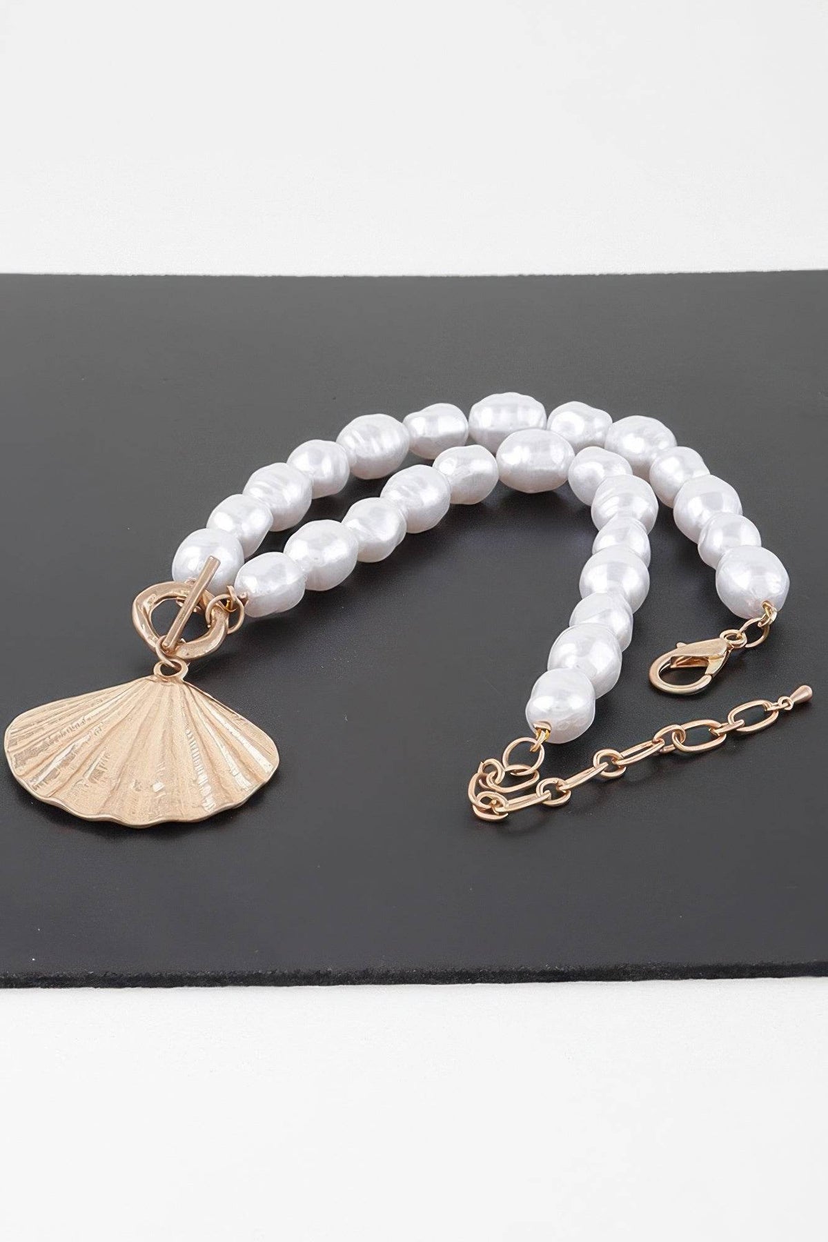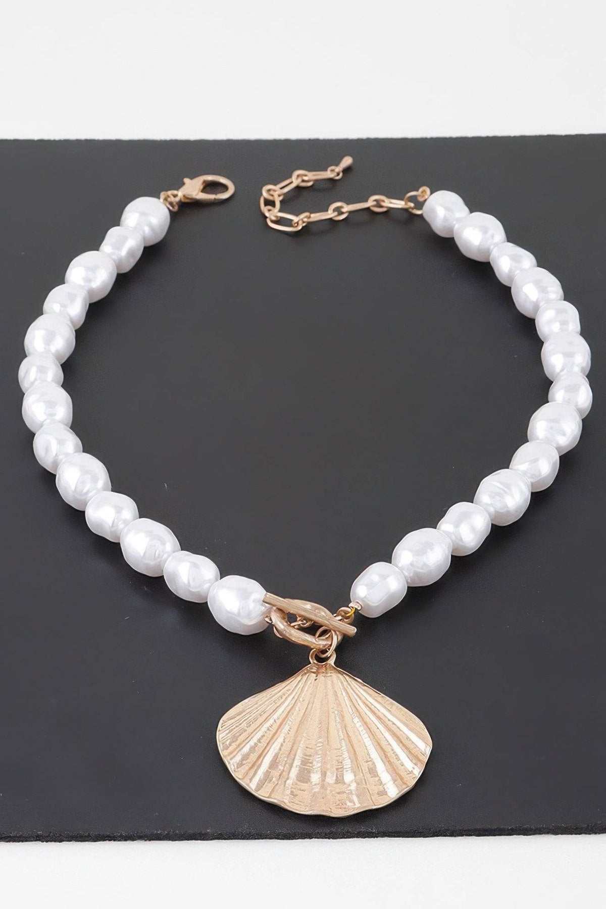 Inspired by the serene beauty of the sea, the Pearl Seashell Toggle Necklace blends coastal charm with timeless elegance. This 14-inch necklace features a strand of lustrous white pearls complemented by a bold gold shell charm, creating a sophisticated balance of texture and shine. The toggle clasp adds a modern, functional touch while enhancing the overall design. Perfect for both seaside escapes and city styling, this piece adds a breezy, refined accent to any look. A beautiful gift or personal keepsake, it captures the spirit of the ocean with elegance and grace.