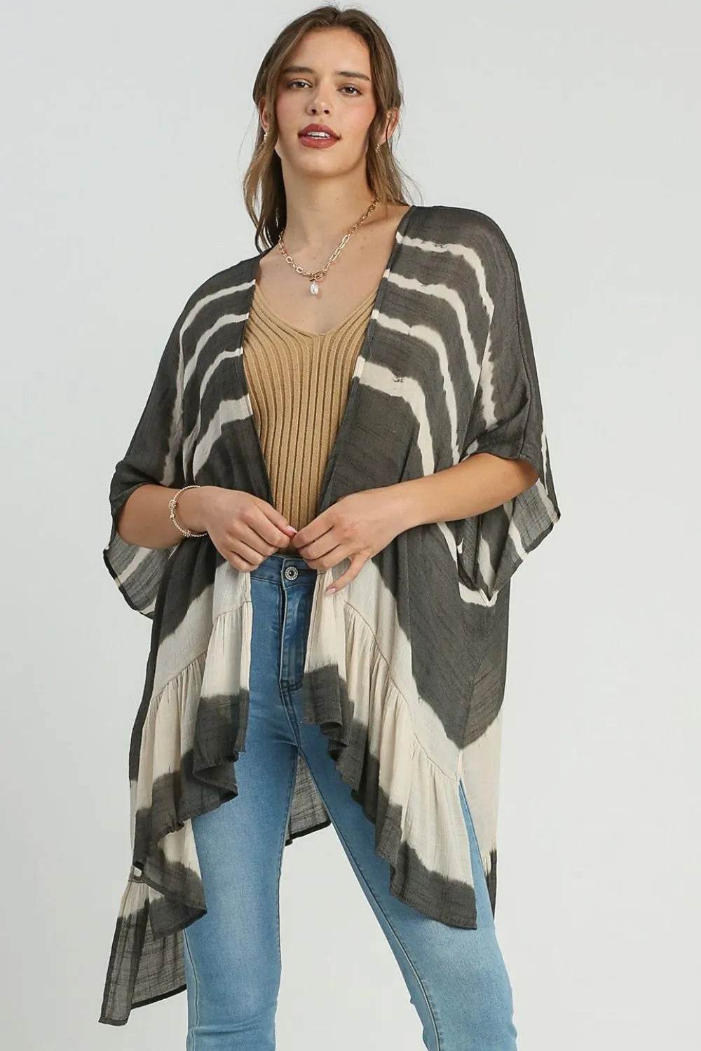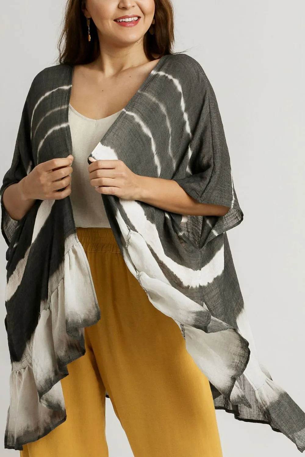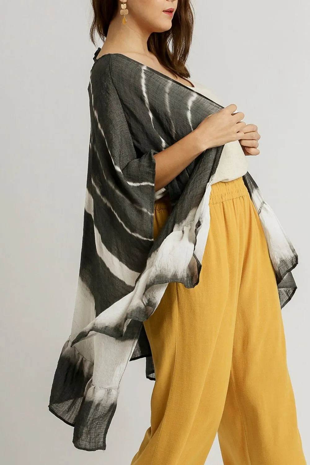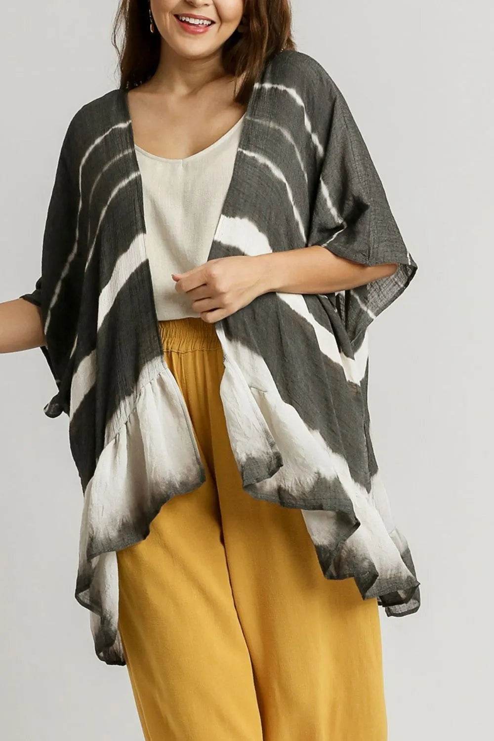 Umgee Full Size Tie Dye Back String Tie Open Front Kimono Sleeve Cover Up Plus Size - Ebony's Shopping