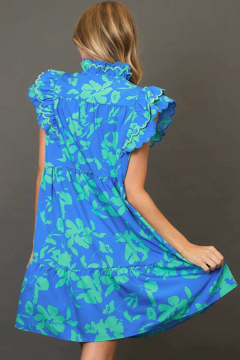 This mini dress features a two-tone floral print, combining two complementary colors for a unique and eye-catching look. The ruffle cap sleeves add a charming and playful detail, enhancing the overall femininity of the dress. The mini length offers a flirty and youthful silhouette, perfect for both casual outings and special occasions. With its floral print and ruffle sleeves, this dress exudes a fresh and stylish vibe that is sure to make a statement.