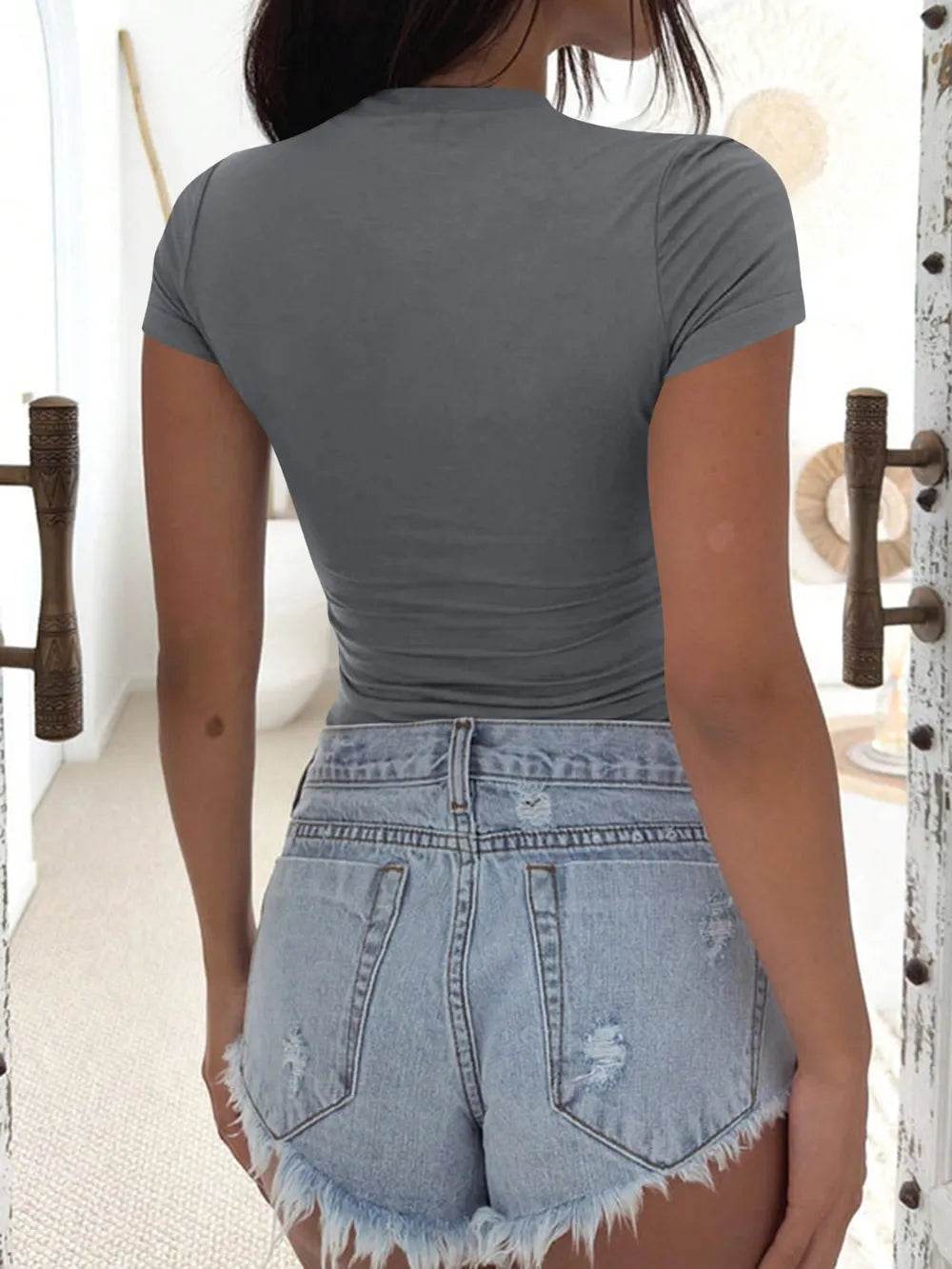 - Features: Tiered, Ruched, Raw Hem