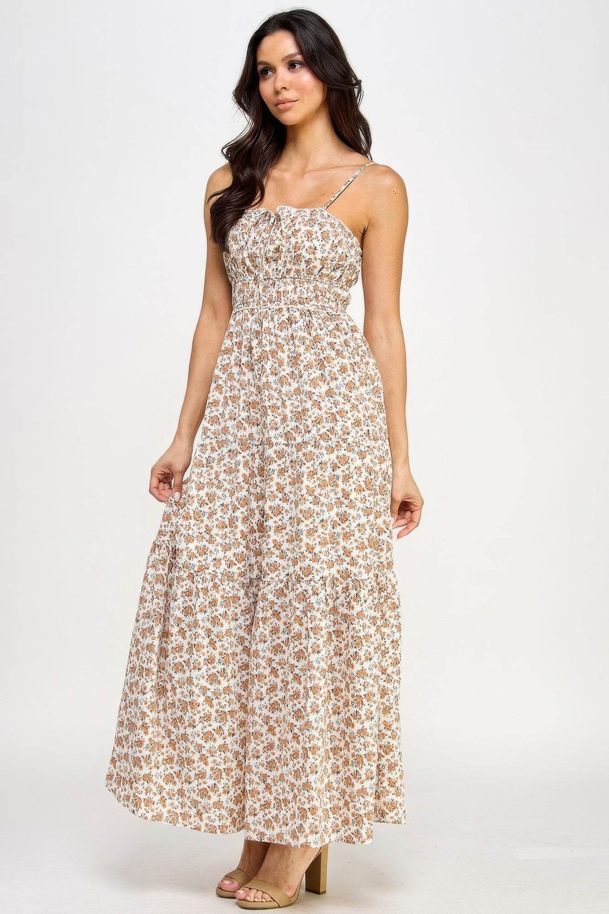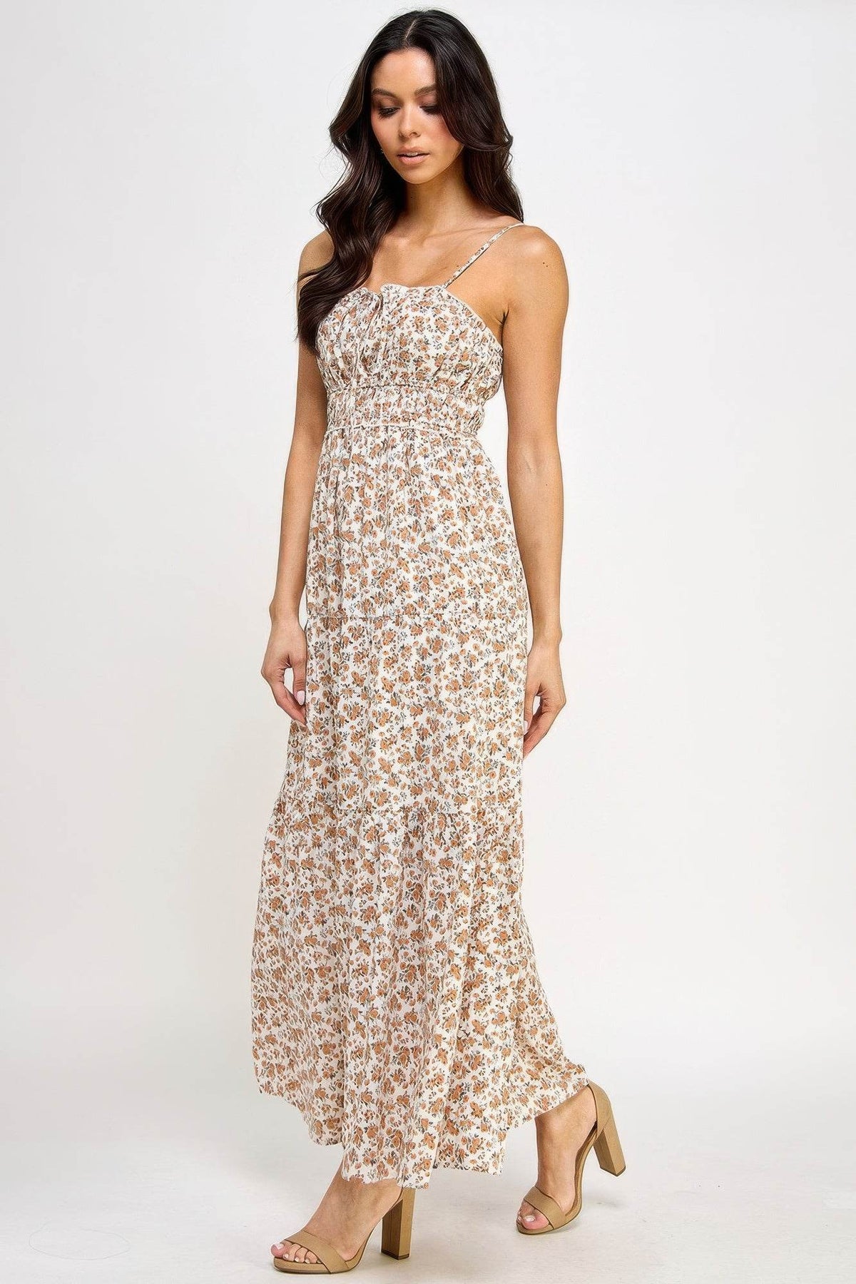 Add the Floral Smocked Ruffle Maxi Dress in Cream to your cart today and enjoy a versatile, elegant piece that's perfect for any occasion!