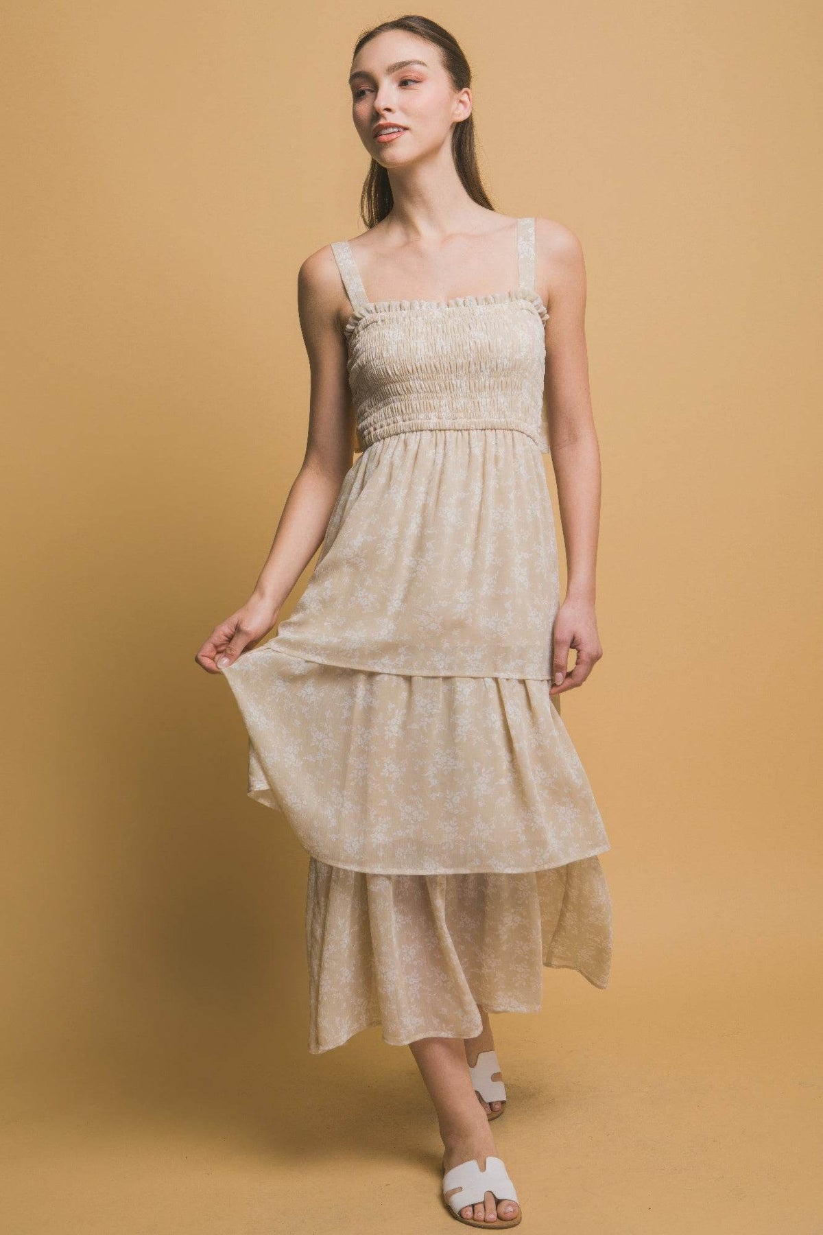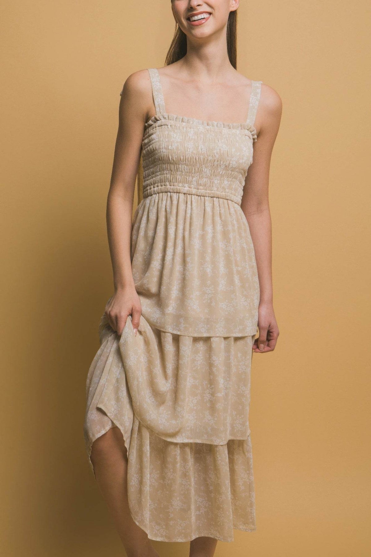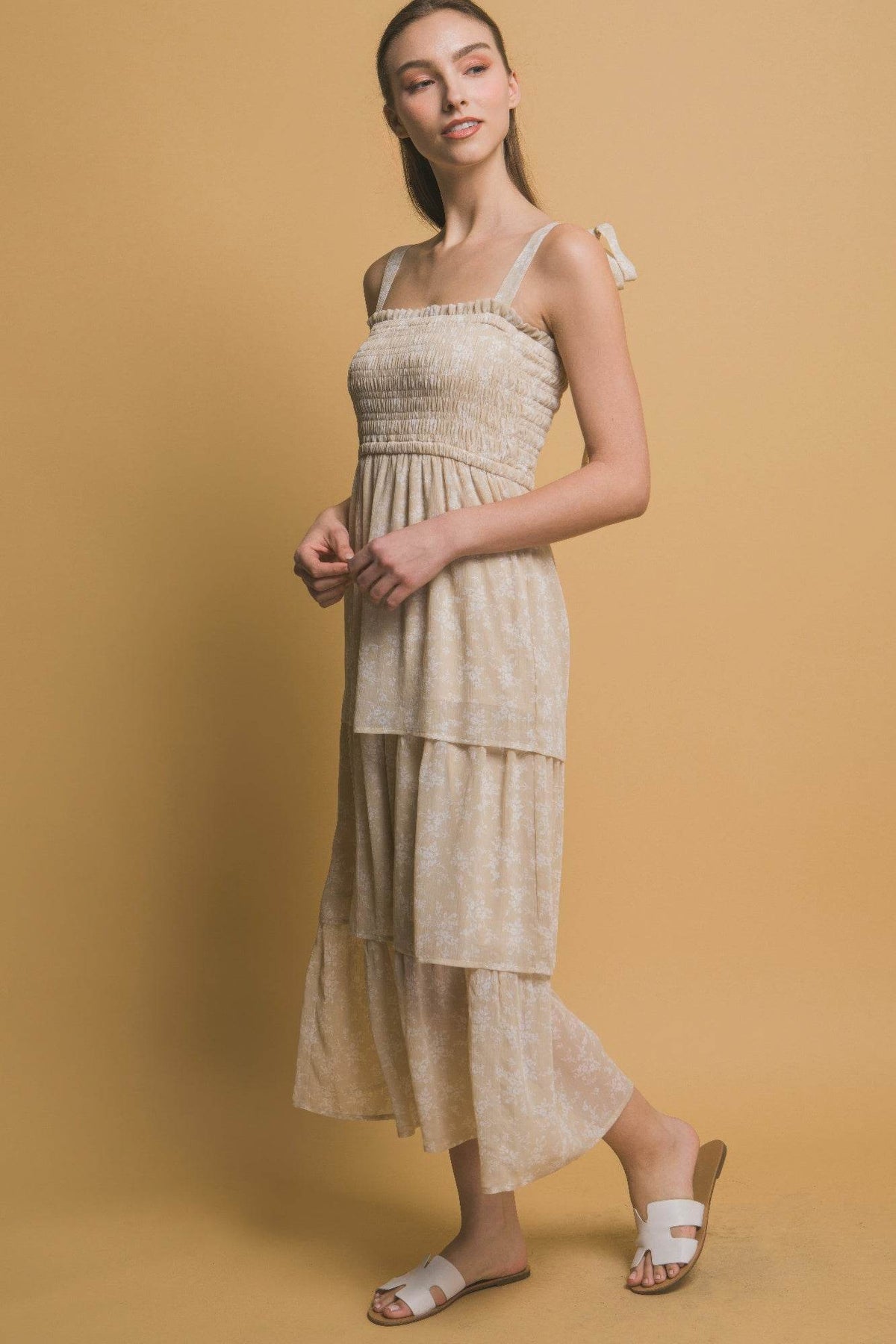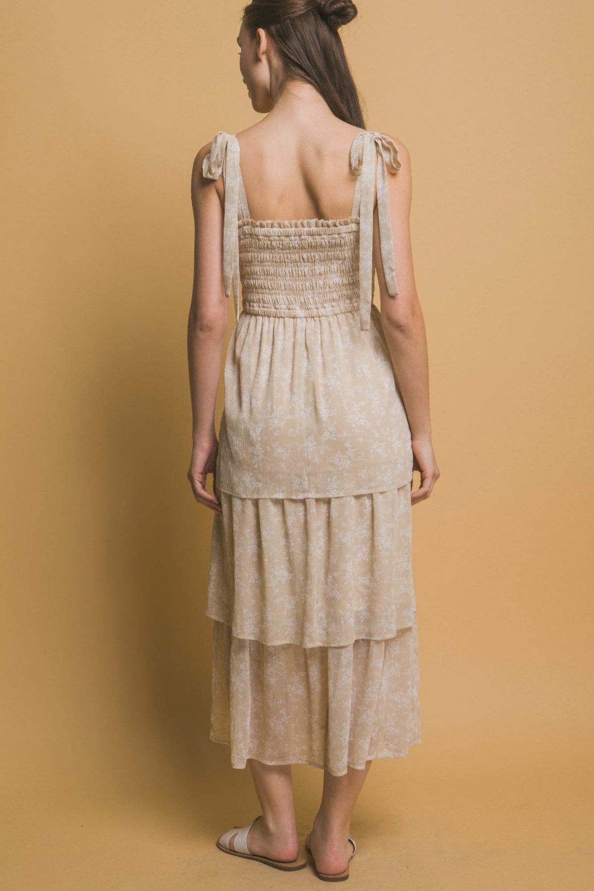 The Tiered Midi Floral Dress is a dreamy and elegant choice for any occasion. Made from 100% polyester chiffon, this dress features a delicate floral pattern that adds a soft, feminine touch. The tiered design creates a flowing silhouette that moves beautifully, while the bow detail on the straps and overlays add an extra layer of sophistication. This midi-length dress strikes the perfect balance between graceful and modern, making it ideal for garden parties, special events, or romantic evenings.