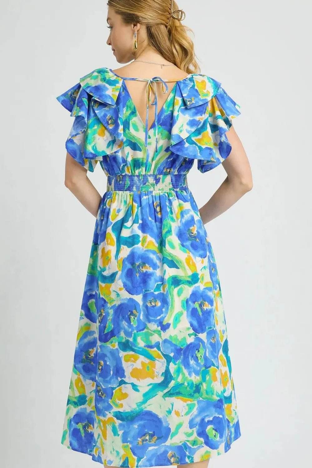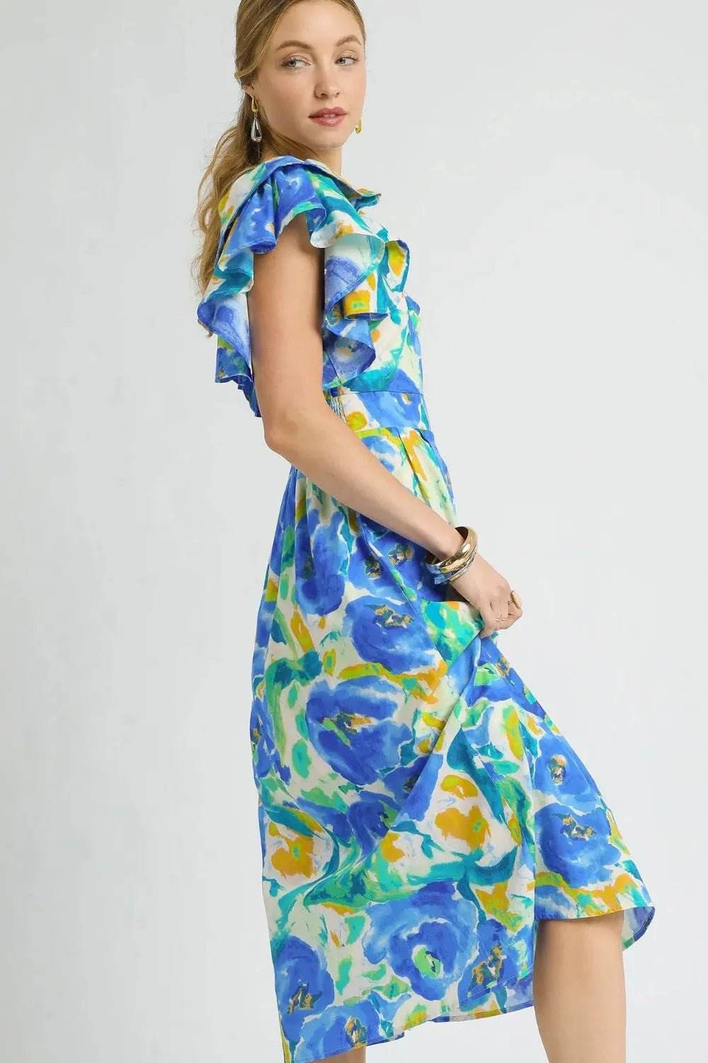 This stunning Blue Floral Ruffle Sleeve Midi Dress features a vibrant botanical print in shades of blue, green, and yellow. Crafted from lightweight, flowing fabric that drapes beautifully, this dress showcases romantic ruffle sleeves and a flattering V-neckline. The midi length and A-line silhouette create an elegant and feminine look perfect for various occasions. The eye-catching floral pattern adds a fresh, garden-inspired charm while the comfortable fit ensures all-day wearability. Ideal for spring and summer styling, this dress combines contemporary design with timeless floral appeal.