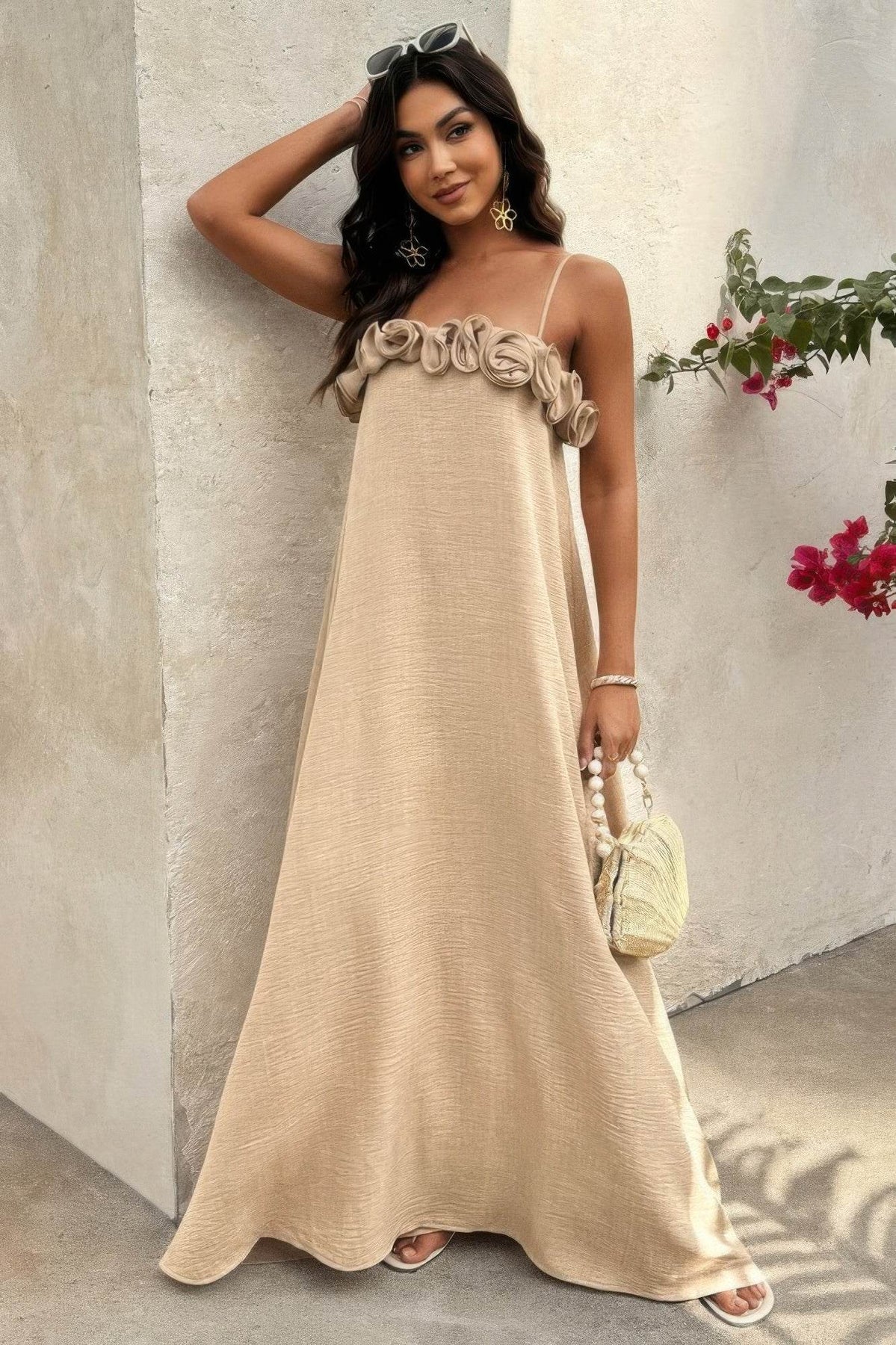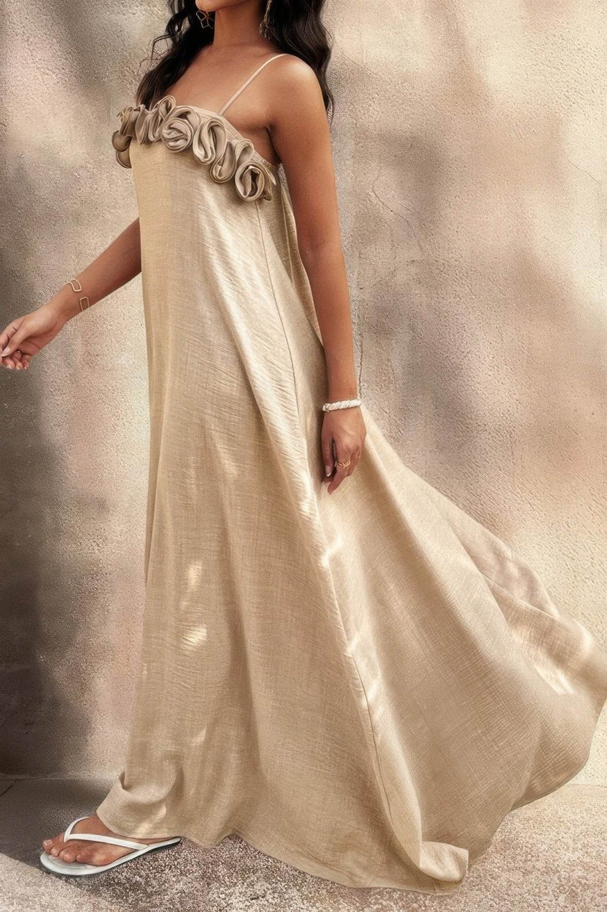 Ruffled detailing adds dimension and soft movement