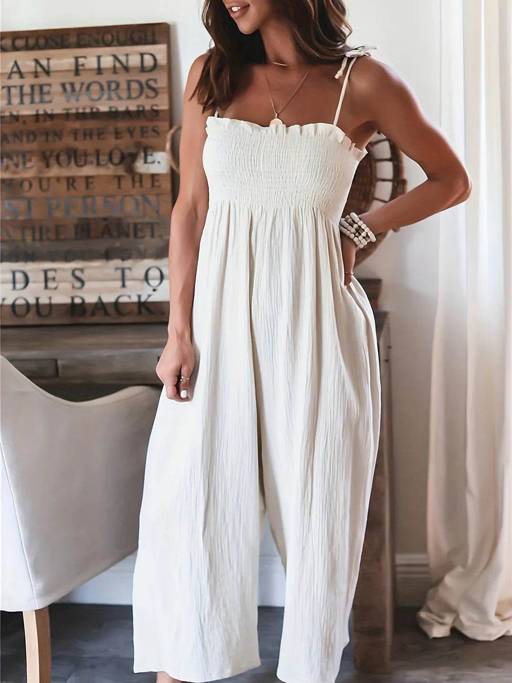 Full Size Smocked Spaghetti Strap Wide Leg Jumpsuit - Ebony's Shopping