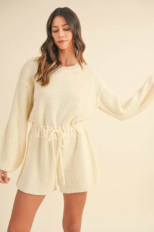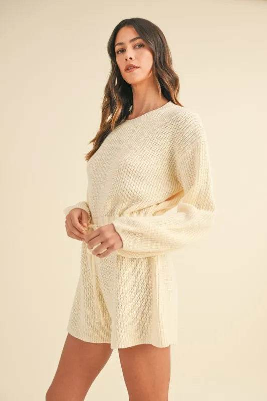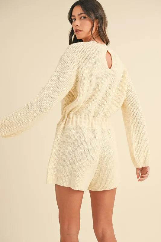 This long sleeve sweater romper features a loose fit design and drawstring waist detailing for a flattering silhouette. The cozy sweater material ensures a comfortable and stylish look. Perfect for both lounging at home or going out, this romper offers versatility and comfort. Pair it with your favorite sneakers or booties for a chic outfit. Elevate your casual wardrobe with this trendy and cozy romper.