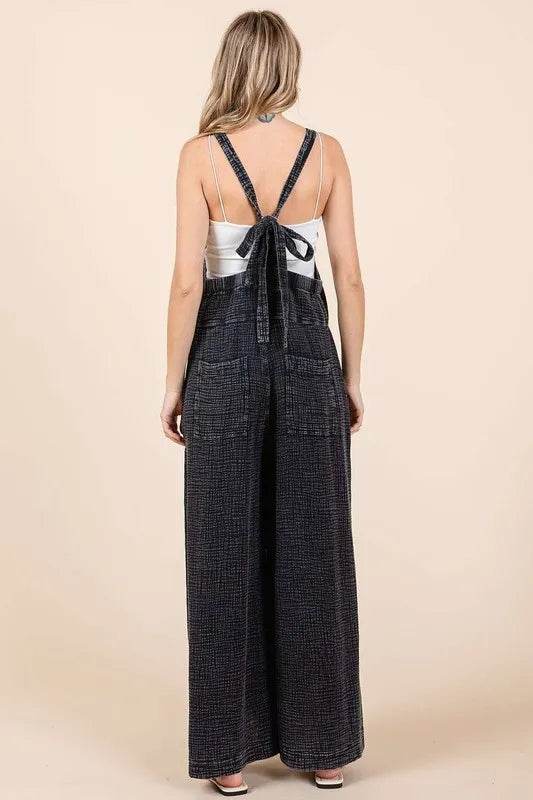 The Textured Wide Leg Overalls is a stylish and contemporary outfit choice. The textured fabric adds visual interest and depth to the overall look, making it a versatile option for various occasions. The wide leg cut offers a comfortable and flattering silhouette that is both trendy and elegant. This jumpsuit can be dressed up with heels and statement jewelry for a sophisticated evening look, or dressed down with sneakers for a more casual vibe. Its versatility and unique texture make it a standout piece in any wardrobe.