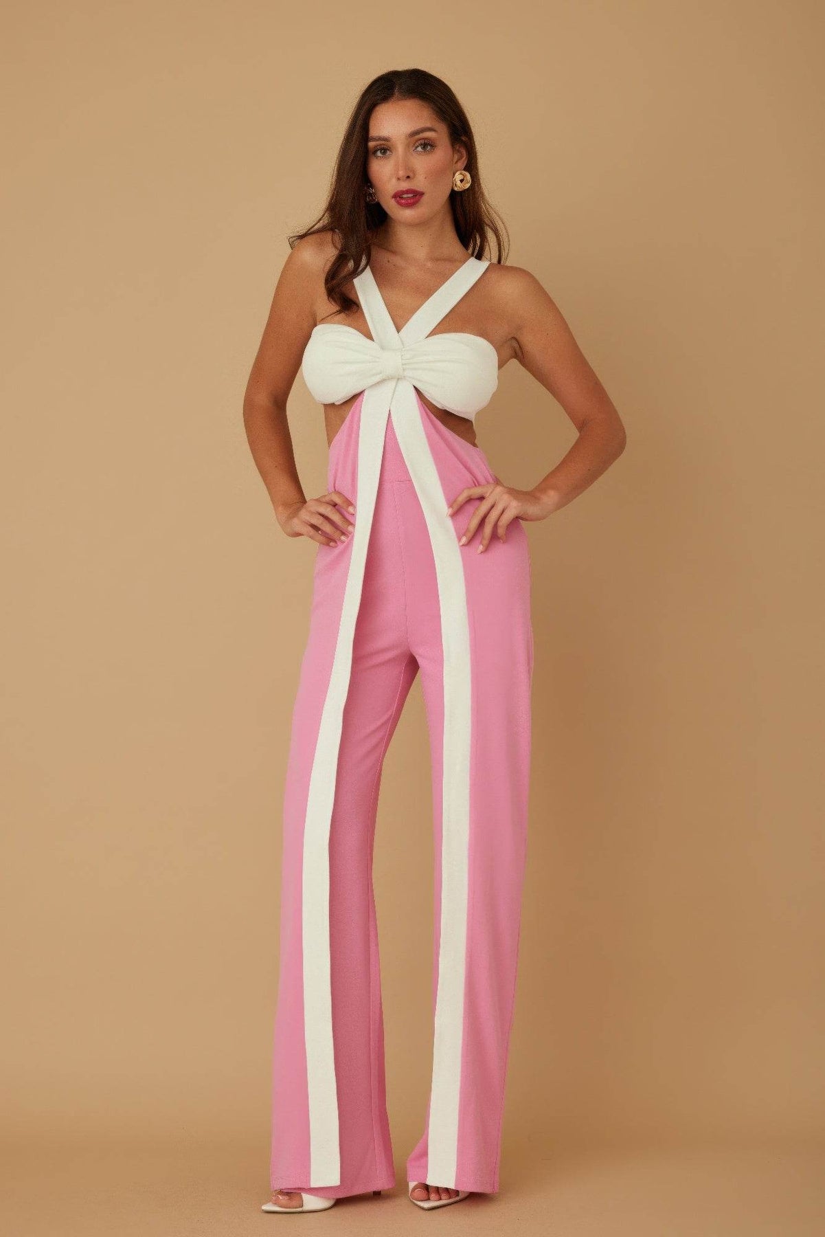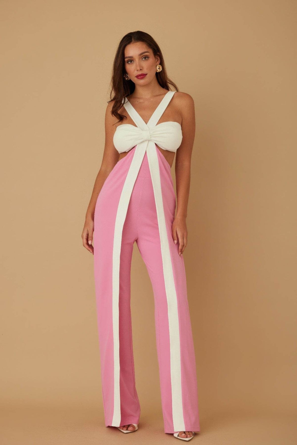 Step into standout style with this X ribbon open jumpsuit, a bold yet refined piece designed to make an entrance. Featuring a unique crisscross ribbon detail across the open front, this jumpsuit offers a daring silhouette with a sophisticated edge. The structured fit elongates the frame, while the open accents and tailored lines create a balance of femininity and power. Perfect for evenings out or elevated occasions, this piece is a confident choice for those who love fashion with impact. Just add heels and minimal accessories to complete the look.
