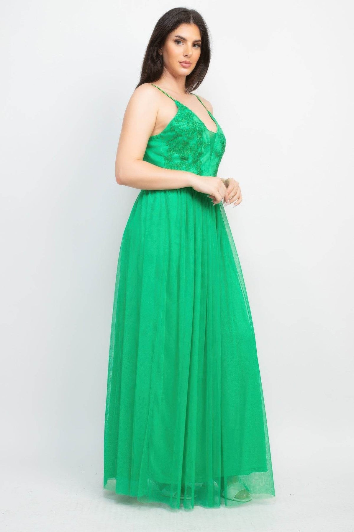 Soft mesh tulle overlay creates an ethereal, flowing look