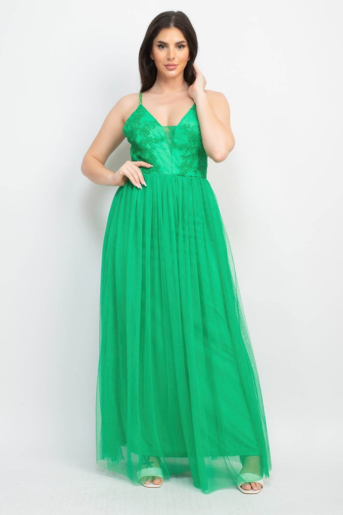 Make a stunning entrance in this glittered straps mesh tulle maxi dress. The ethereal design is crafted from a knit fabric and layered with delicate tulle that flows beautifully with every step. Glittered straps and shimmering details add a touch of glamour, while the embroidered bodice brings a romantic, feminine flair. The A-line silhouette is both flattering and elegant, making it perfect for special occasions. Finished with a concealed back zipper, this dress ensures a seamless and comfortable fit, so you can move and dance with confidence.
