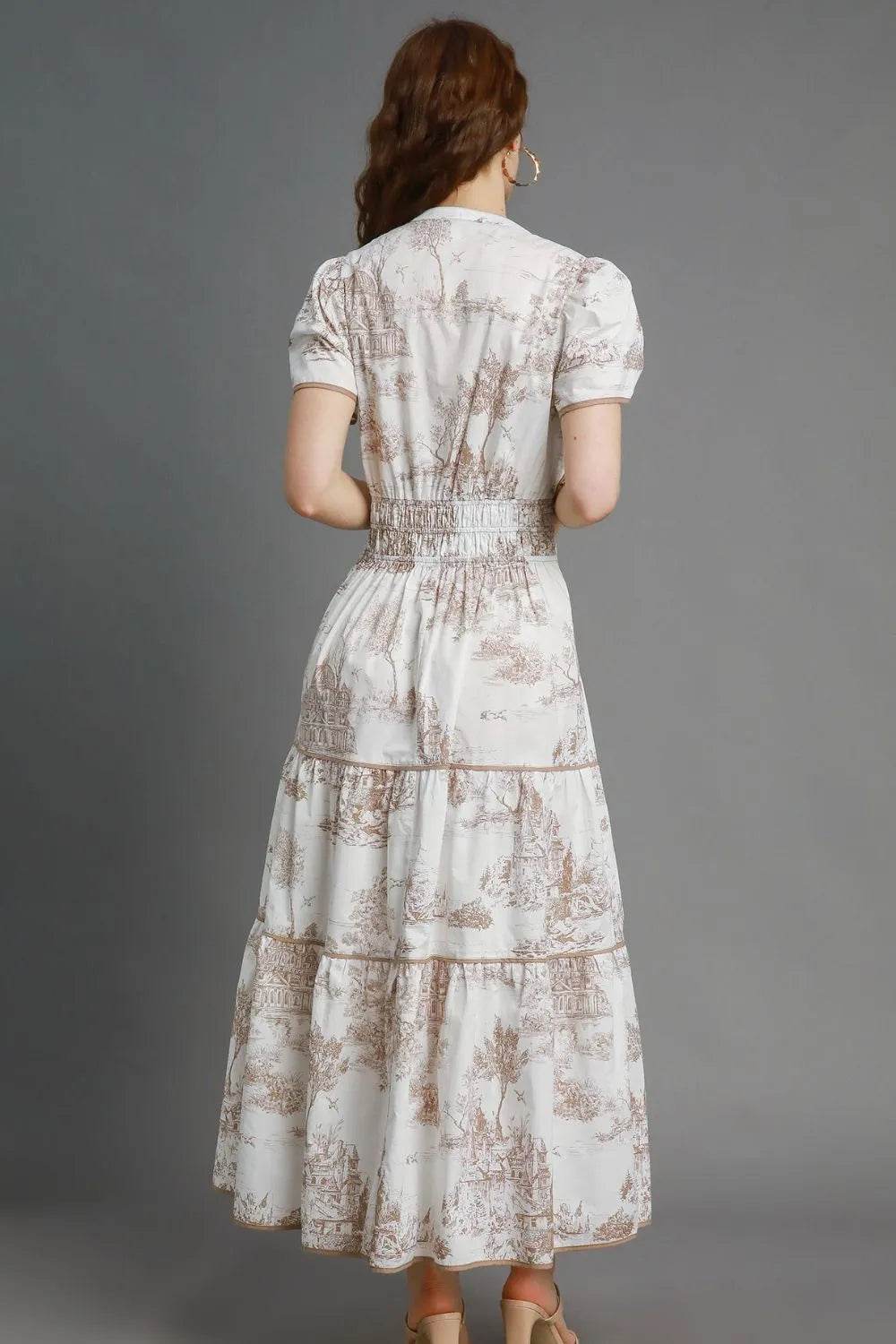 A landscape print short sleeve tiered maxi dress is a stylish and versatile piece that features a maxi length skirt with tiered layers for added movement and dimension. The dress typically has short sleeves, making it ideal for warm weather or casual occasions. The landscape print design showcases scenic motifs such as mountains, forests, or seascapes, adding a whimsical and unique touch to the dress. This type of dress is perfect for creating a bohemian or romantic look, and can be accessorized with sandals and a statement necklace for a complete outfit.