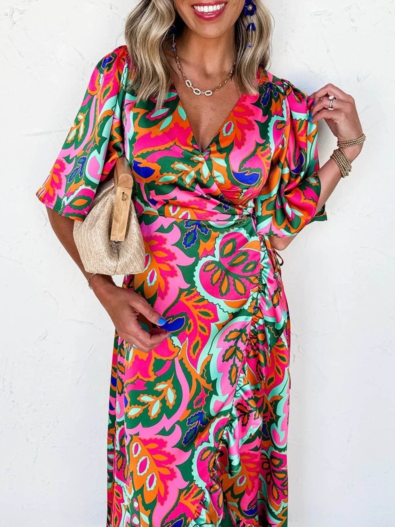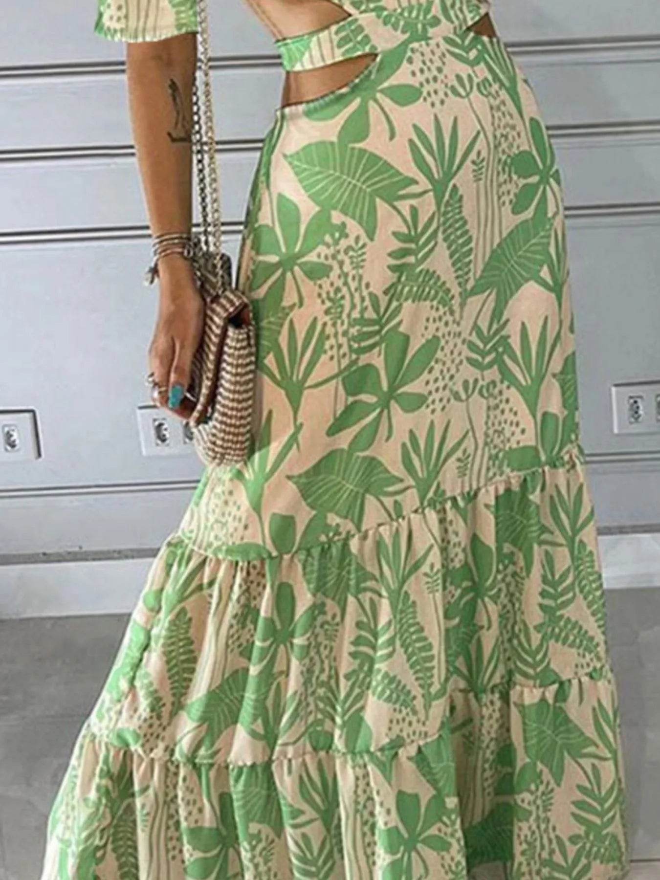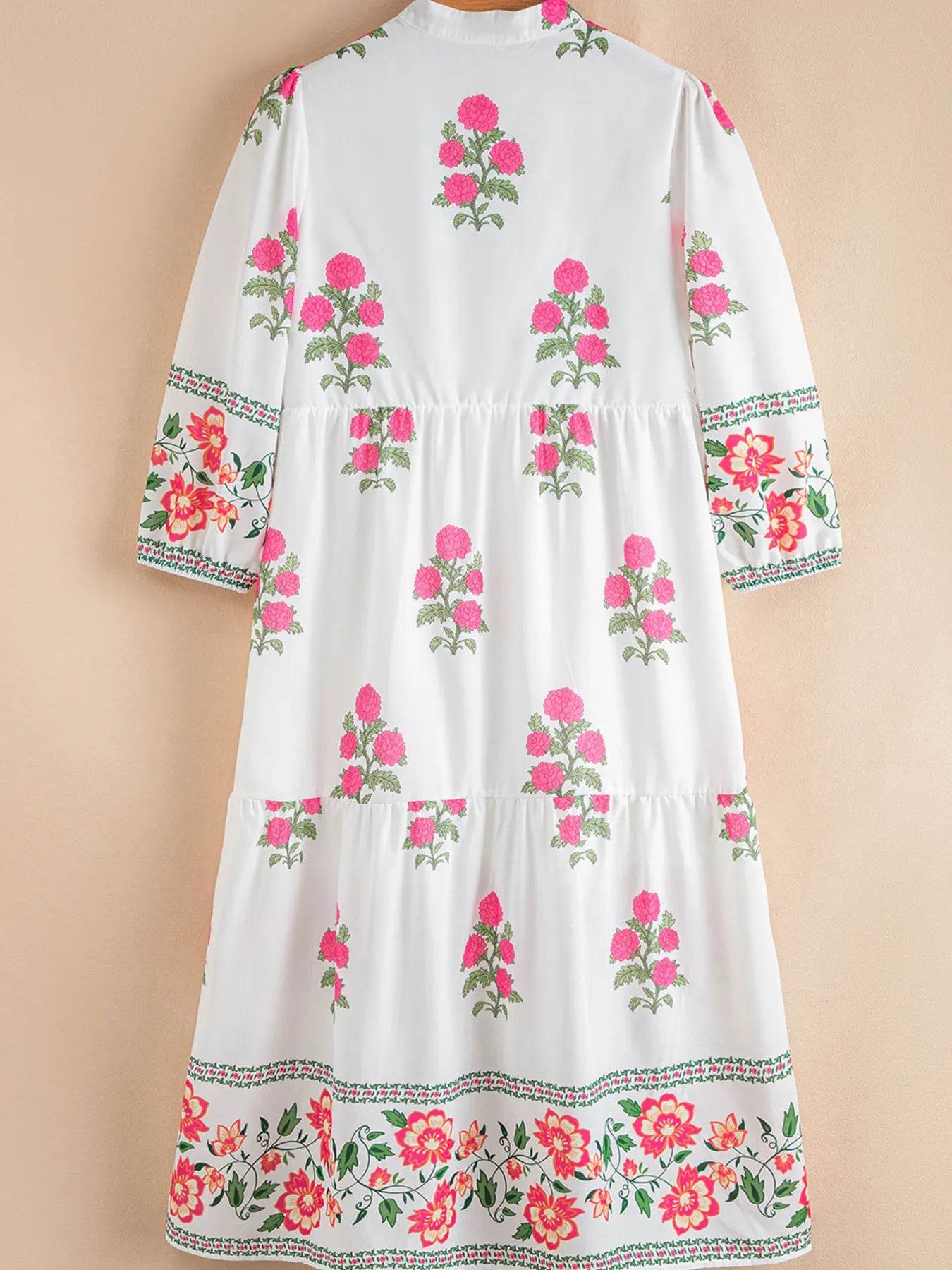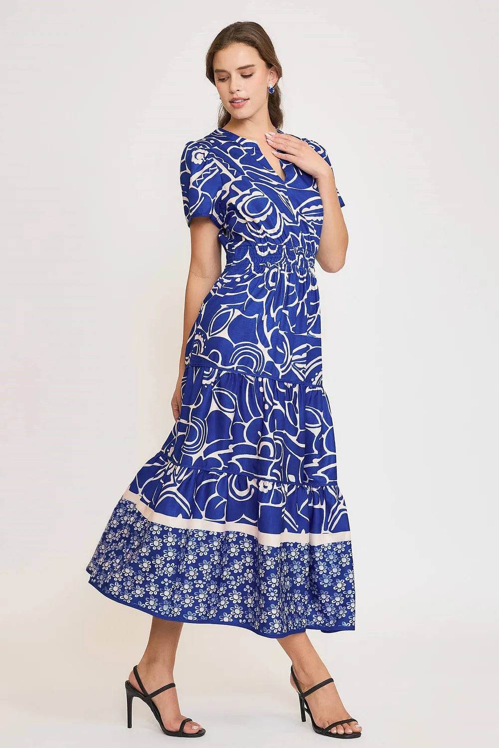 The Printed Notched Short Sleeve Tiered Dress is a stylish and versatile choice for any occasion. With its flattering notched neckline and tiered design, this dress offers a chic and feminine look that is perfect for day-to-night wear.