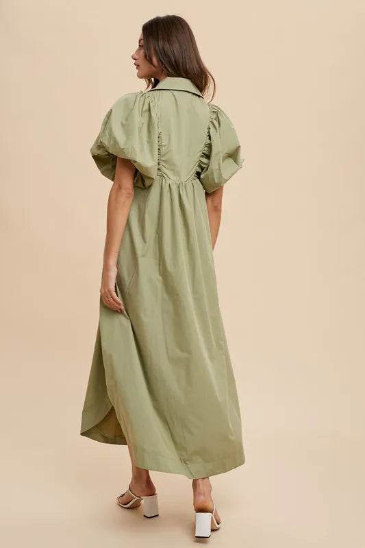 The Smocked Puff Sleeve Midi Dress is a trendy and feminine choice for any occasion. This dress features smocked detailing, creating a flattering and comfortable fit. The puff sleeves add a touch of drama and style, while the midi length offers a sophisticated and elegant look. Perfect for both casual and dressy events, this dress can be dressed up with heels or down with sneakers for a versatile outfit. With its chic design and on-trend silhouette, the Smocked Puff Sleeve Midi Dress is a must-have addition to your wardrobe.