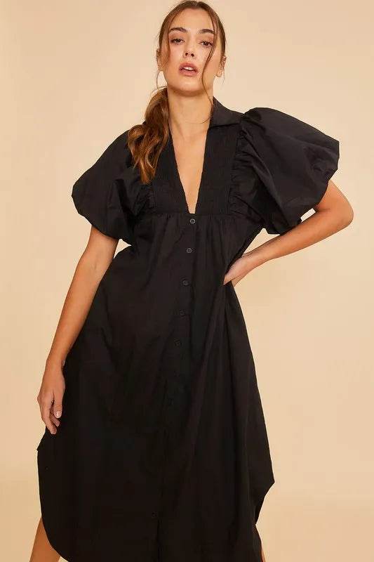 The Smocked Puff Sleeve Midi Dress is a trendy and feminine choice for any occasion. This dress features smocked detailing, creating a flattering and comfortable fit. The puff sleeves add a touch of drama and style, while the midi length offers a sophisticated and elegant look. Perfect for both casual and dressy events, this dress can be dressed up with heels or down with sneakers for a versatile outfit. With its chic design and on-trend silhouette, the Smocked Puff Sleeve Midi Dress is a must-have addition to your wardrobe.