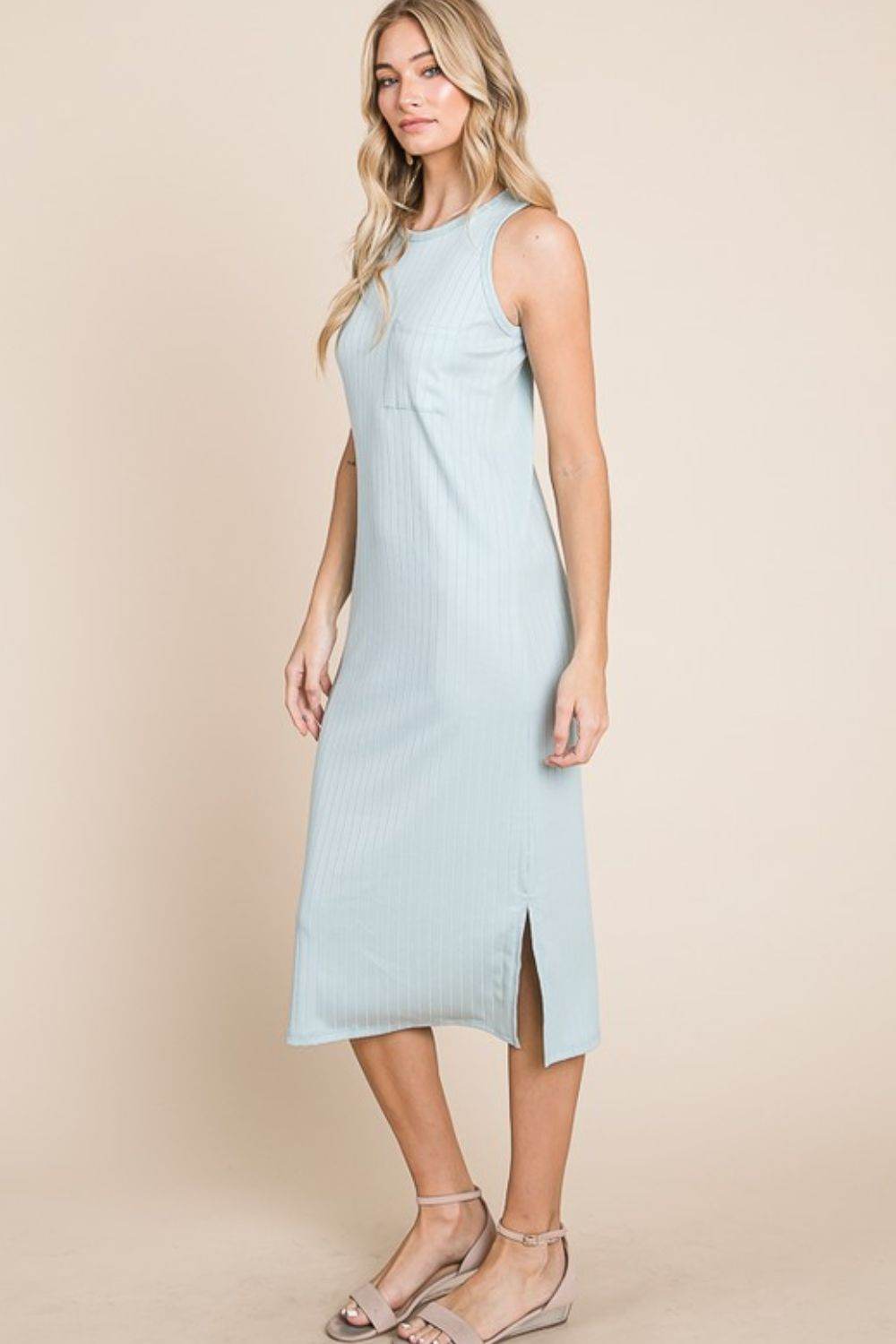 A ribbed knit sleeveless midi dress is a versatile and stylish clothing item that can be worn for various occasions. The ribbed knit fabric adds texture and dimension to the dress, while the sleeveless style makes it perfect for the warmer months. The midi length strikes a balance between being chic and comfortable. This dress can be dressed up with heels and statement jewelry for a more formal look, or dressed down with sandals or sneakers for a more casual vibe. It's a great addition to any wardrobe for a polished and effortless outfit option.