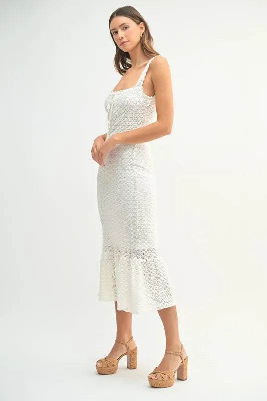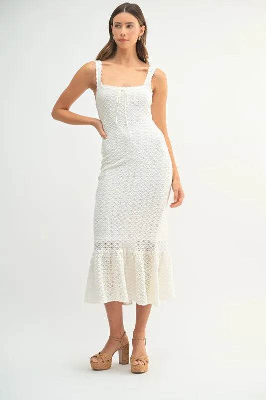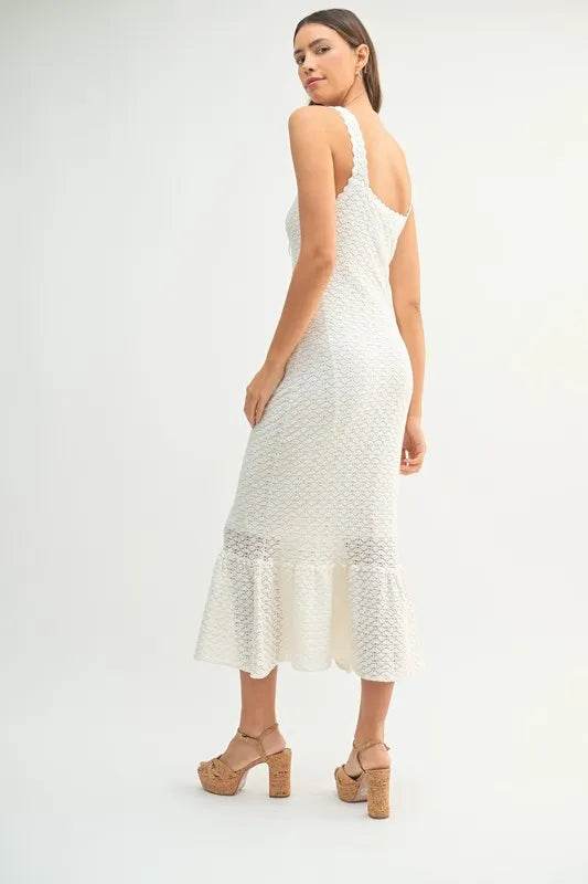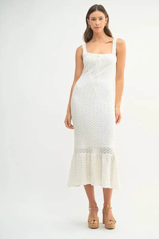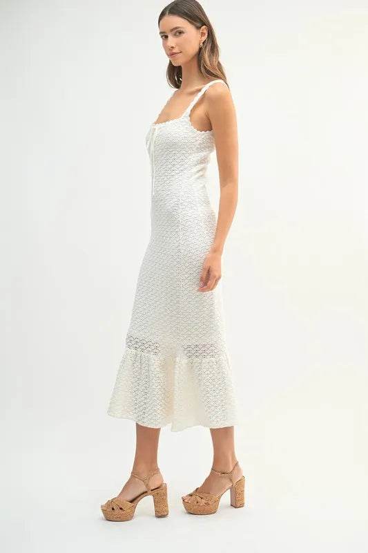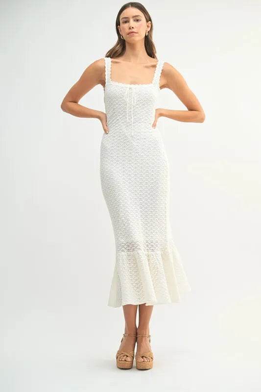 This Ruffled Hem Sleeveless Crochet Knit Midi Dress is a charming and elegant piece with a crochet knit design and a feminine ruffled hem. The sleeveless style is perfect for warm weather, while the midi length offers a classy and versatile look. Ideal for a summer soirée or a special occasion, this dress combines texture and style to create a graceful and sophisticated ensemble.