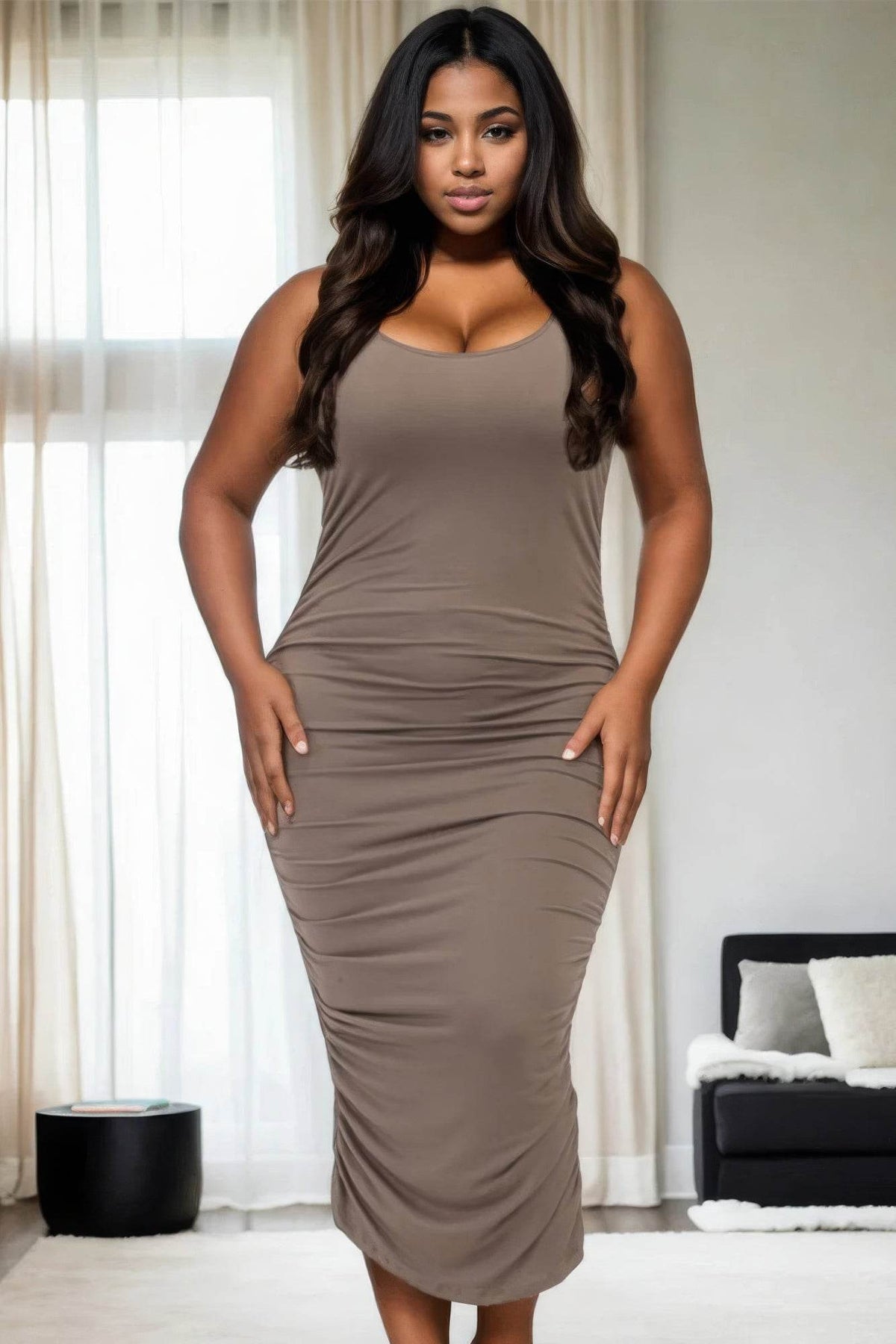 Make a statement and turn heads with our Plus Size Square Neck Ruched Bodycon Midi Dress in taupe. Add it to your wardrobe today and experience the perfect fusion of fashion and comfort!
