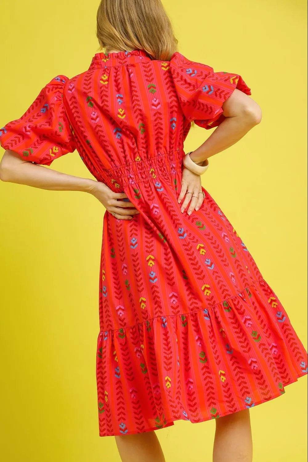 This stunning bohemian-inspired midi dress features a vibrant coral red base adorned with colorful geometric aztec patterns in blue, yellow, and white. Crafted from lightweight, breathable fabric perfect for warm weather, the dress showcases a flattering V-neckline with decorative button detailing and feminine short puff sleeves. The elastic smocked waistband creates a comfortable, figure-flattering silhouette while the tiered ruffle hem adds movement and charm. This versatile piece transitions seamlessly from casual daywear to evening occasions, making it an essential addition to any wardrobe.