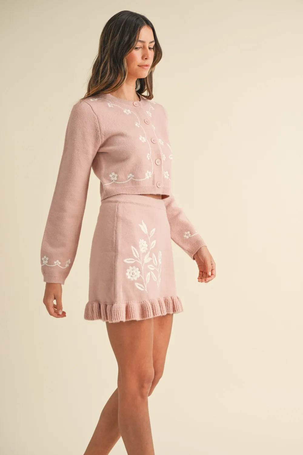 This charming set features a solid knit long-sleeve cardigan adorned with delicate floral embroidery, offering a touch of elegance and warmth. The button-down design adds a classic flair, while the matching ruffled mini skirt enhances the playful, feminine appeal. Perfect for adding a stylish and coordinated look to your wardrobe, this set seamlessly blends comfort with sophistication. The versatile design allows for easy pairing with various accessories and footwear, making it ideal for both casual and dressy occasions. Embrace a timeless aesthetic with this beautiful ensemble that showcases intricate detailing and modern style.