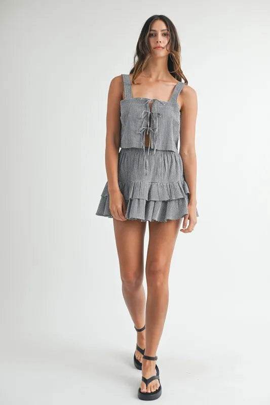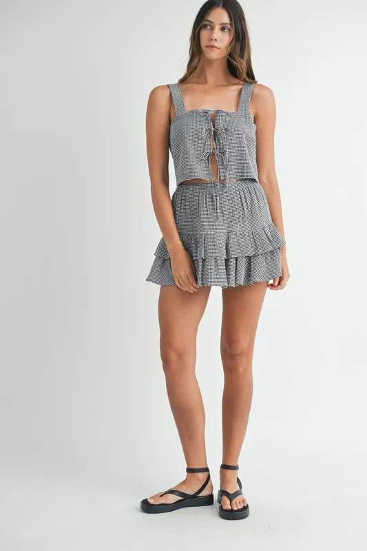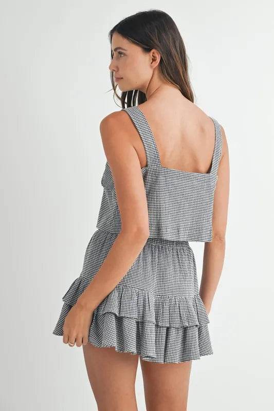 A gingham plaid crop top and mini skirt set is a cute and trendy outfit choice. The classic gingham pattern adds a touch of vintage charm to the ensemble, while the crop top and mini skirt silhouette give it a modern and playful vibe. You can style this set with sneakers for a casual look or dress it up with heels for a more polished appearance. Enjoy mixing and matching this fun and stylish set for a variety of occasions!
