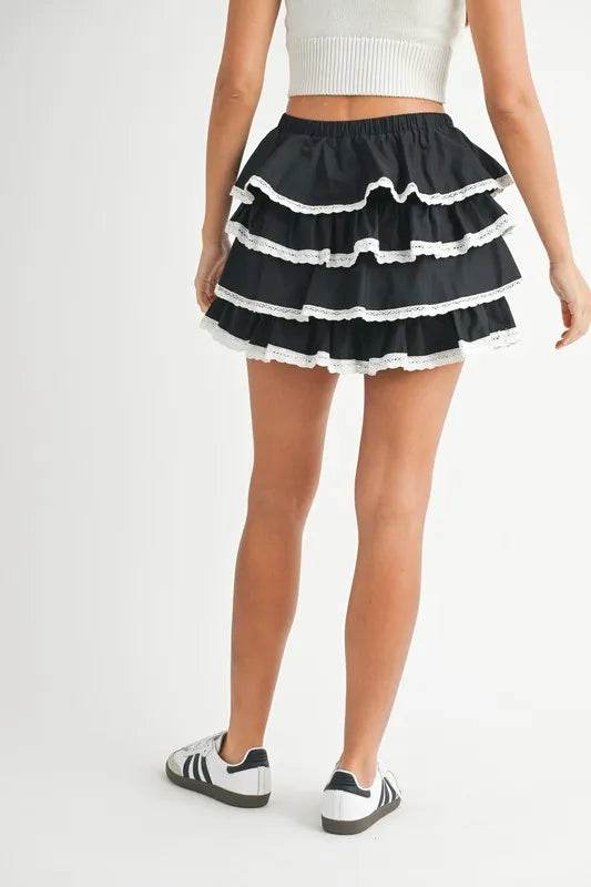 The poplin ruffle layered contrast lace trim mini skirt is a playful and stylish choice for a fun outfit. The ruffle layers add a flirty and feminine touch to the skirt, while the contrast lace trim brings a chic and trendy detail. Perfect for a night out or a summer event, this mini skirt exudes a youthful and fashionable vibe. Pair it with a crop top or a fitted blouse for a modern and eye-catching ensemble that showcases your unique style.