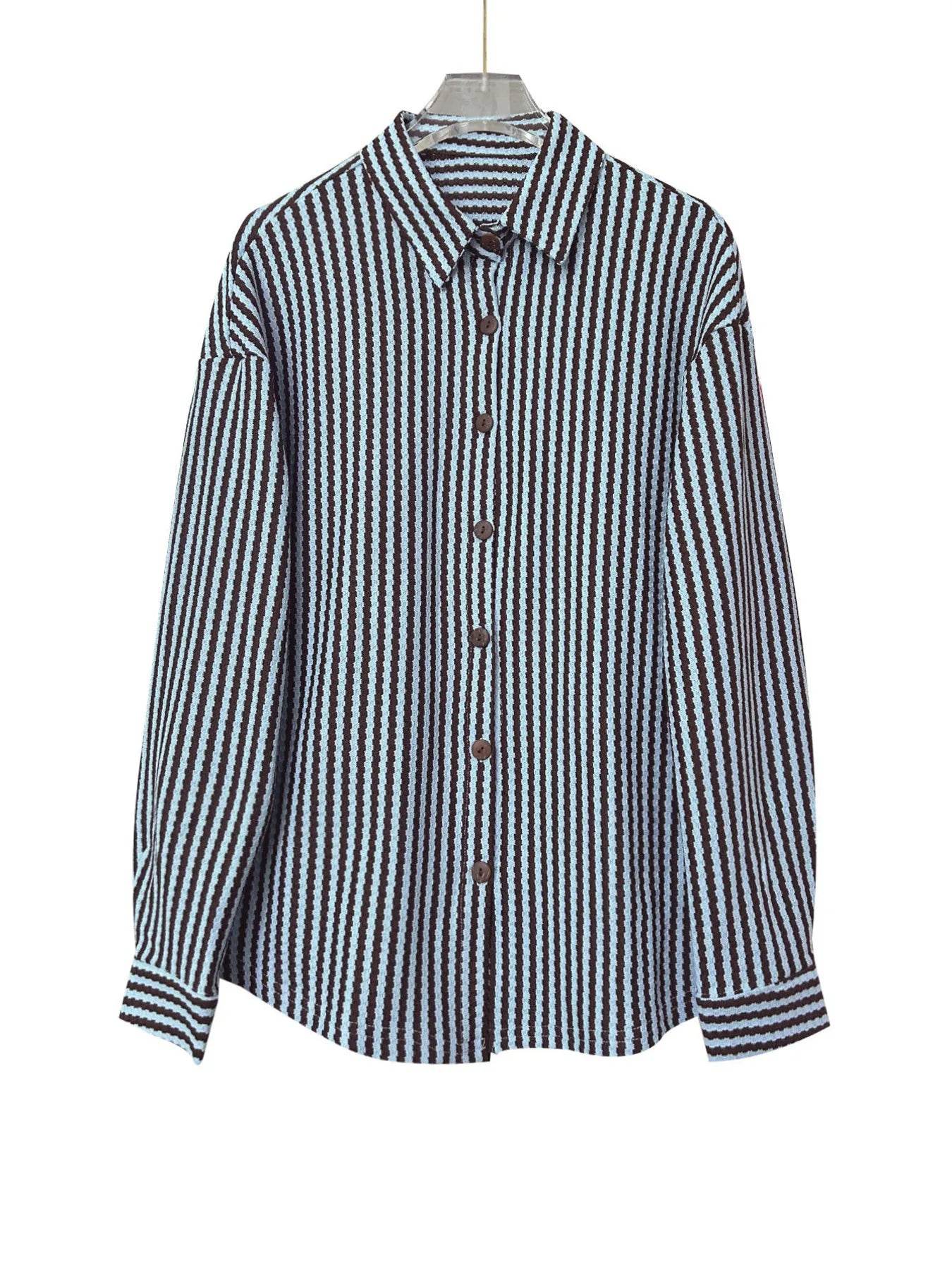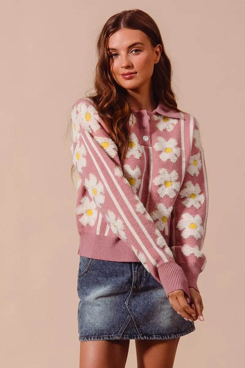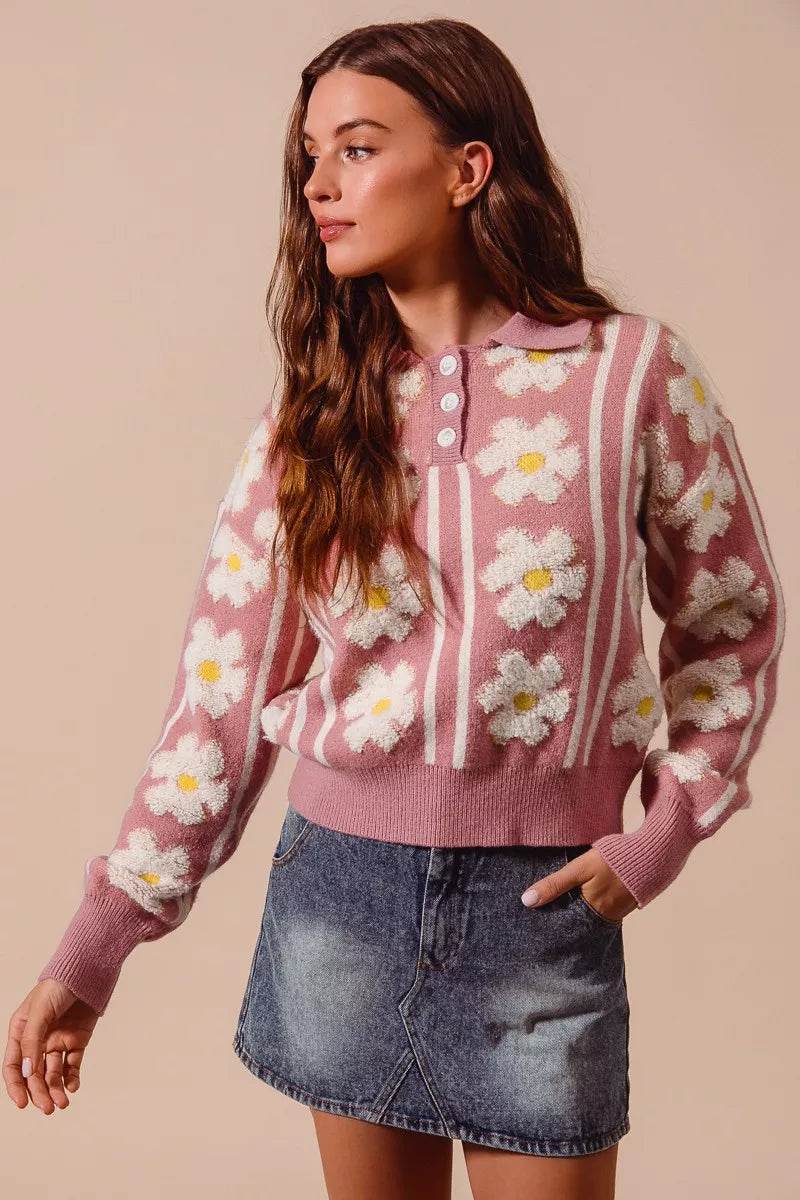Make a statement with this Floral Stripe Polo Collar Sweater. The unique combination of floral and stripe patterns creates a stylish and sophisticated look. The polo collar adds a touch of elegance to the sweater. Perfect for adding a pop of color and pattern to your outfit. Pair it with tailored pants or jeans for a versatile and fashionable ensemble. Elevate your wardrobe with this chic and eye-catching sweater.
