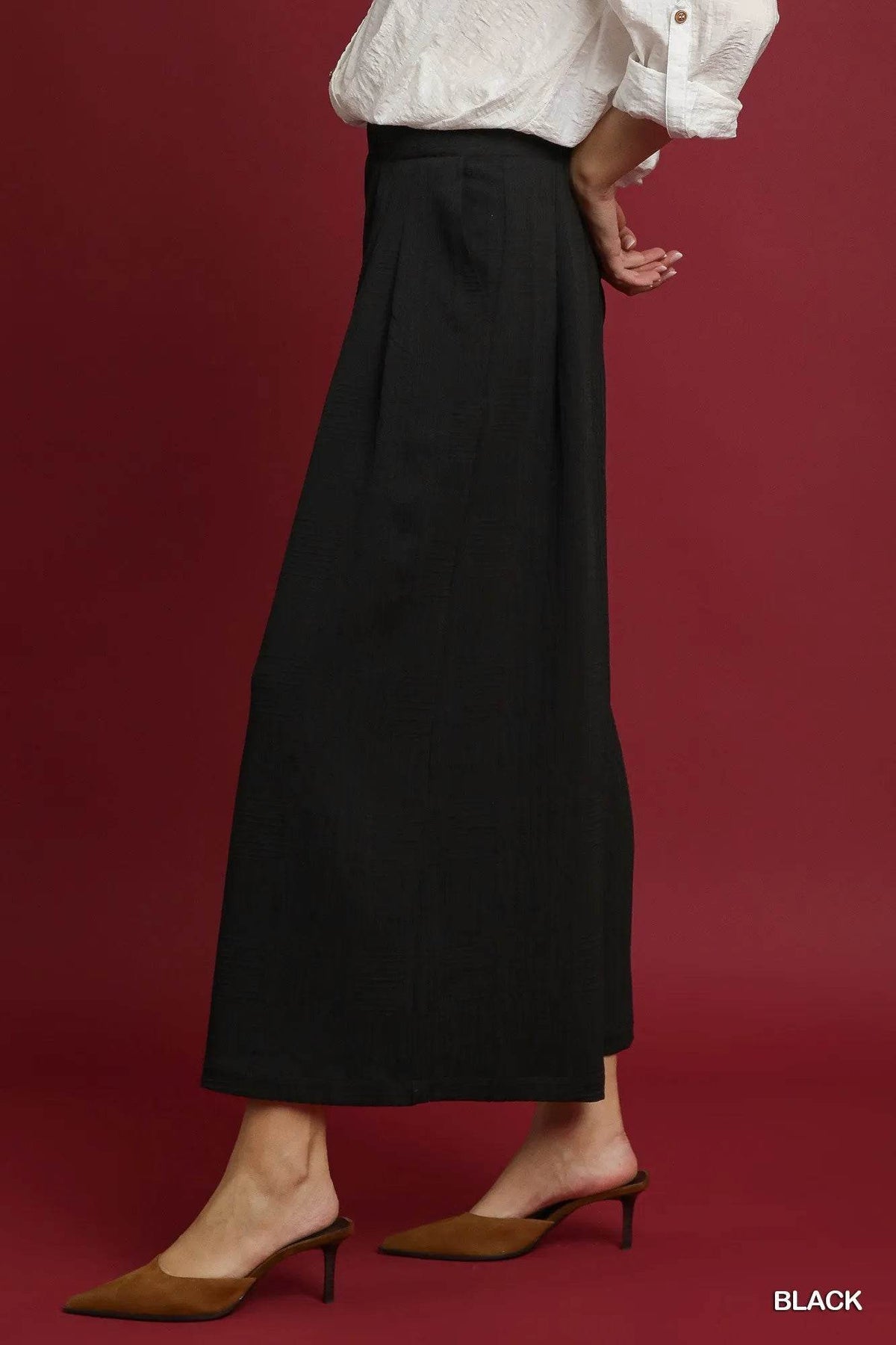 These elegant high-waisted wide-leg culotte pants feature a sophisticated black fabric with excellent drape and flow. Made from premium quality material that maintains its shape while providing comfort throughout the day. The high-waisted design creates a flattering silhouette that elongates the legs, while the wide-leg cut offers freedom of movement and modern styling. The cropped ankle length adds a contemporary touch, making these pants perfect for professional settings or elevated casual wear. The versatile black color ensures easy coordination with various tops and accessories, making them an essential wardrobe staple for the modern woman seeking both comfort and sophistication.