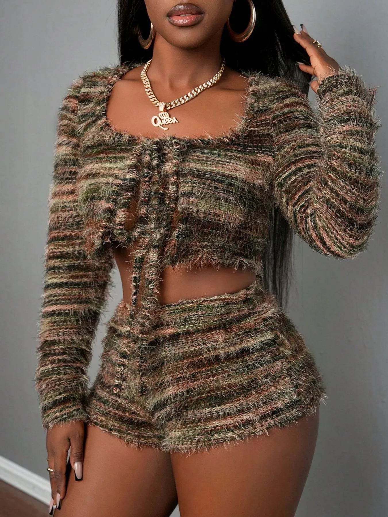 A slub long sleeve top and shorts set is a coordinated outfit made from textured slub fabric, known for its unique appearance. This set typically includes a relaxed-fit top with long sleeves and matching shorts for a comfortable and stylish ensemble. Perfect for lounging or casual outings, the slub fabric is lightweight and breathable, making it ideal for warm weather. The coordinated set offers a put-together look without the need for mixing and matching separate pieces. With its soft, cozy feel and easy-to-wear design, this set is a versatile and trendy option for a casual and laid-back style.