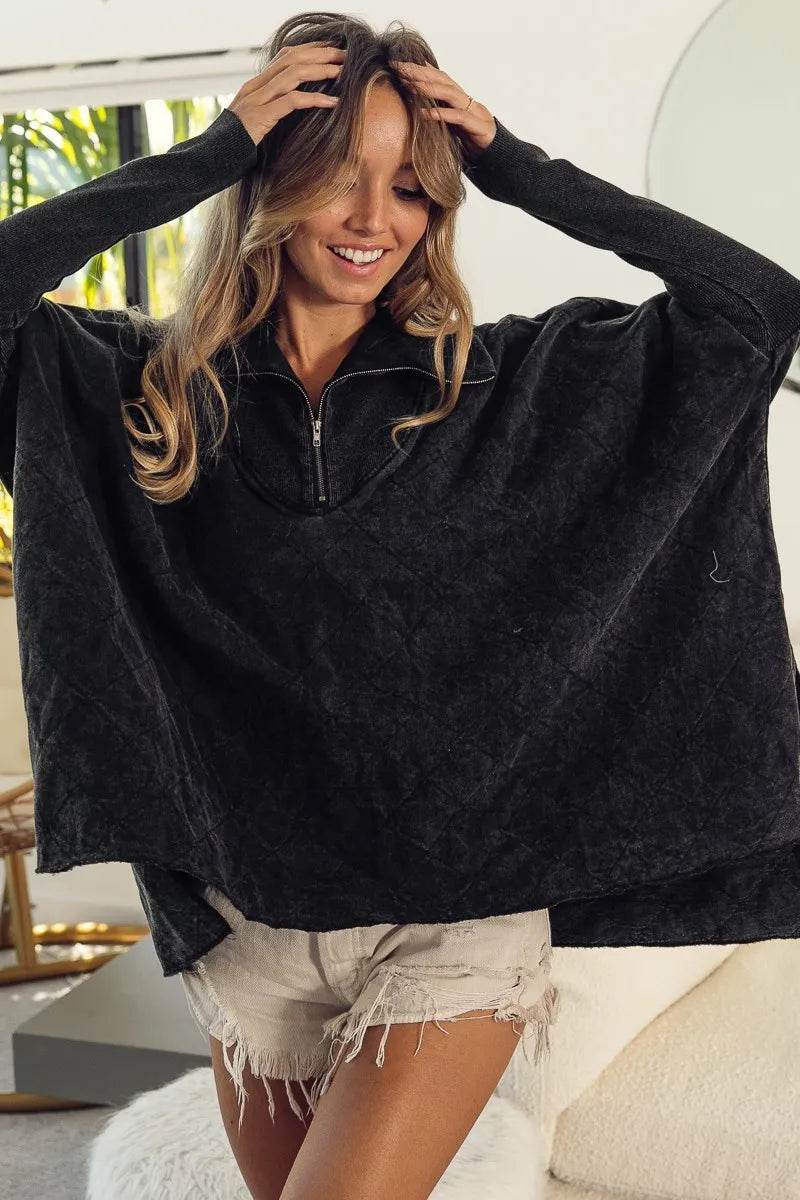 This premium oversized quarter-zip pullover sweatshirt features a luxuriously soft cotton-polyester blend construction with fleece lining for superior comfort and warmth. The relaxed fit silhouette offers effortless style while the quarter-zip closure provides adjustable ventilation. Designed with ribbed cuffs and hem for shape retention, this versatile piece transitions seamlessly from casual loungewear to street-ready fashion. The extended tunic length provides flattering coverage, making it perfect for pairing with leggings or jeans. Crafted for durability and comfort, this sweatshirt maintains its shape and softness wash after wash.