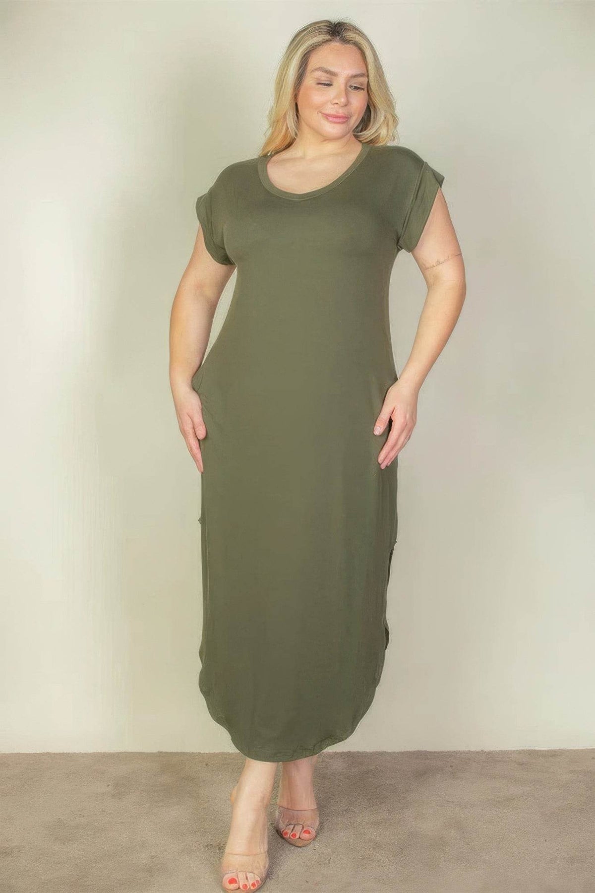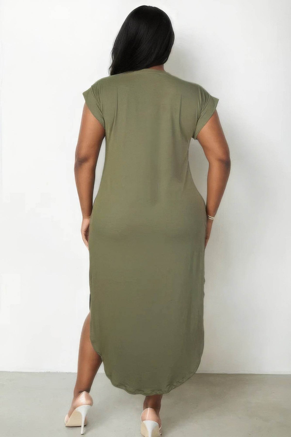 Elevate your style with our Plus Size Hidden Pocket Batwing Sleeve V Neck Long Dress in olive. Experience comfort, elegance, and convenience in one stunning ensemble!