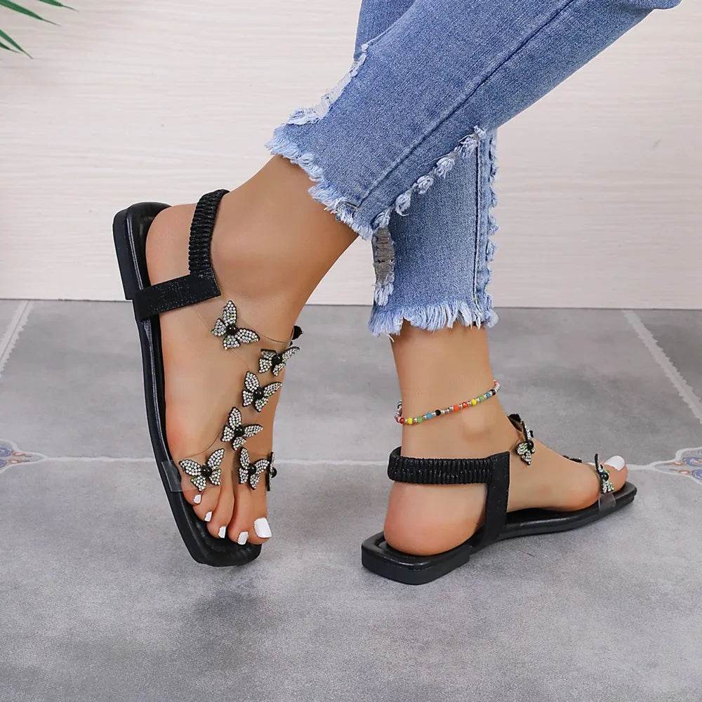 Rhinestone Butterfly Flat Sandals - Ebony's Shopping