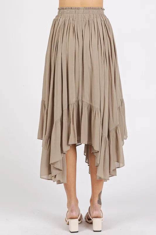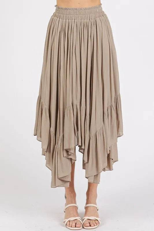 The Handkerchief Hem Elastic Waist Pocket Midi Skirt is a stylish and practical addition to your wardrobe. The handkerchief hem creates a unique and flowy silhouette that adds movement to your outfit. With an elastic waistband and pockets, this skirt combines comfort and functionality. Perfect for both casual and dressy occasions, it can be dressed up or down easily. Pair it with a tucked-in blouse and heels for a chic look, or with a simple top and sandals for a more relaxed vibe.